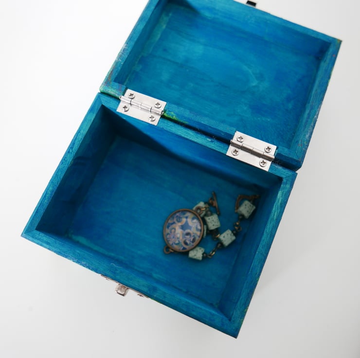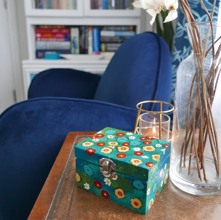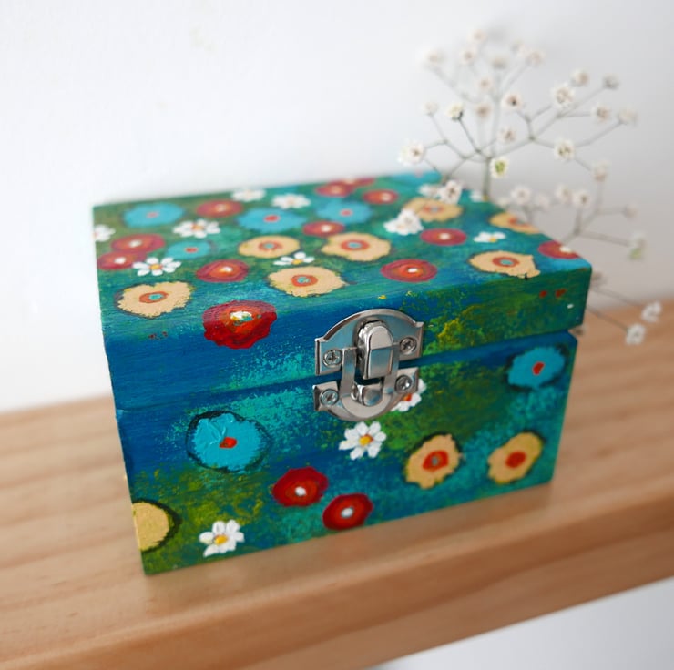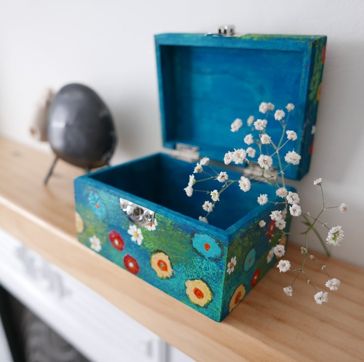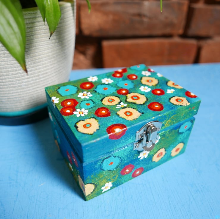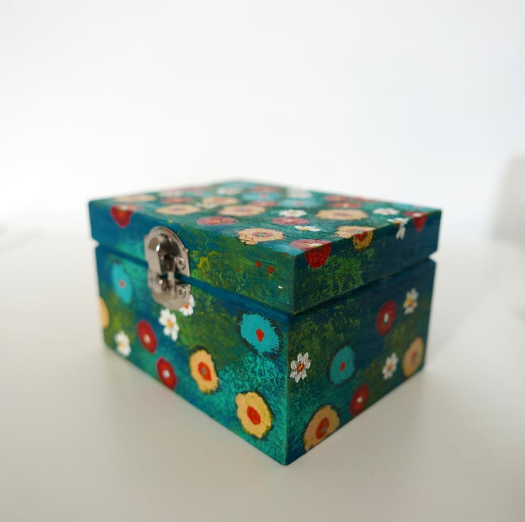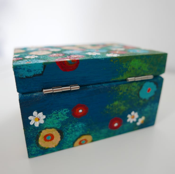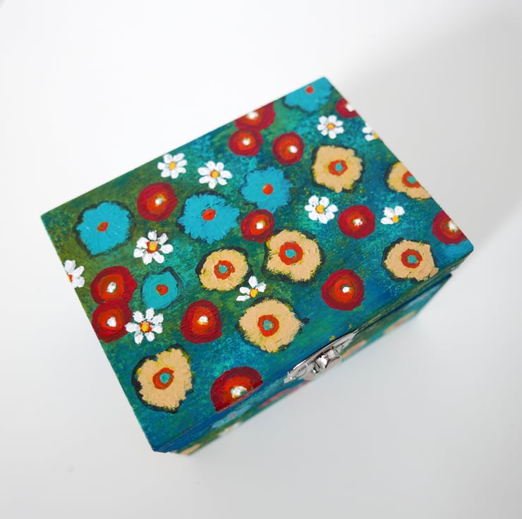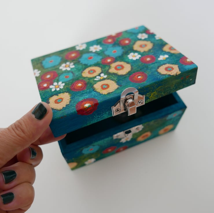 This floral painted box is perfect to keep small items like jewellery, hair ties, seed packets and other collectables. The measurements are: 4.75" x 3.75" (12cm x 9cm) and 2.75" (7cm) high. The box is varnished for protection but please handle it with care. It is painted inside with teal colour.