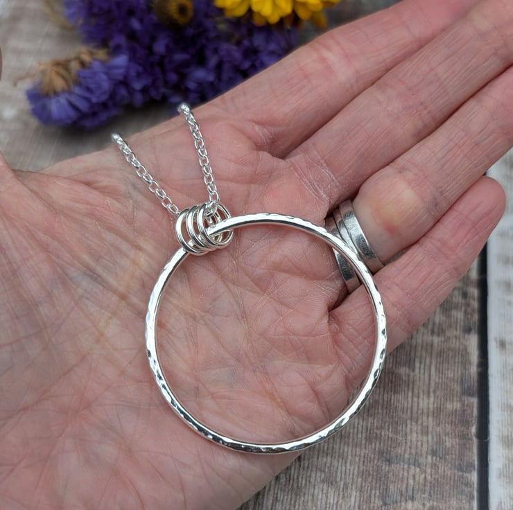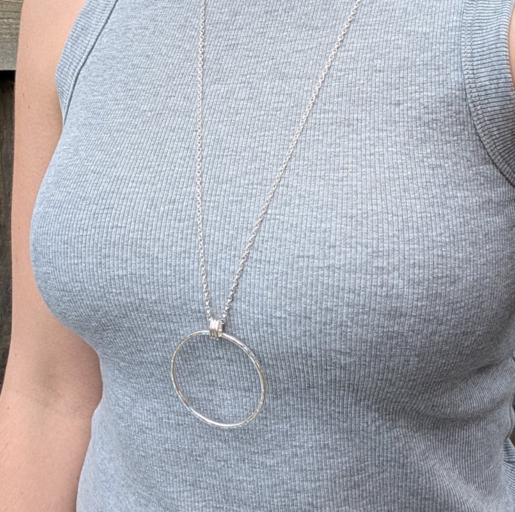 This handmade sterling silver long circle necklace features a beautifully hammered finish, adding a touch of texture and shine. Made in Bristol, UK, from recycled sterling silver, the large, open circle pendant is designed to rest gracefully on a long chain, creating a striking and modern silhouette. The minimalist design makes it a versatile piece, perfect for layering or wearing solo as a statement accessory.
