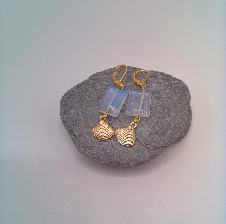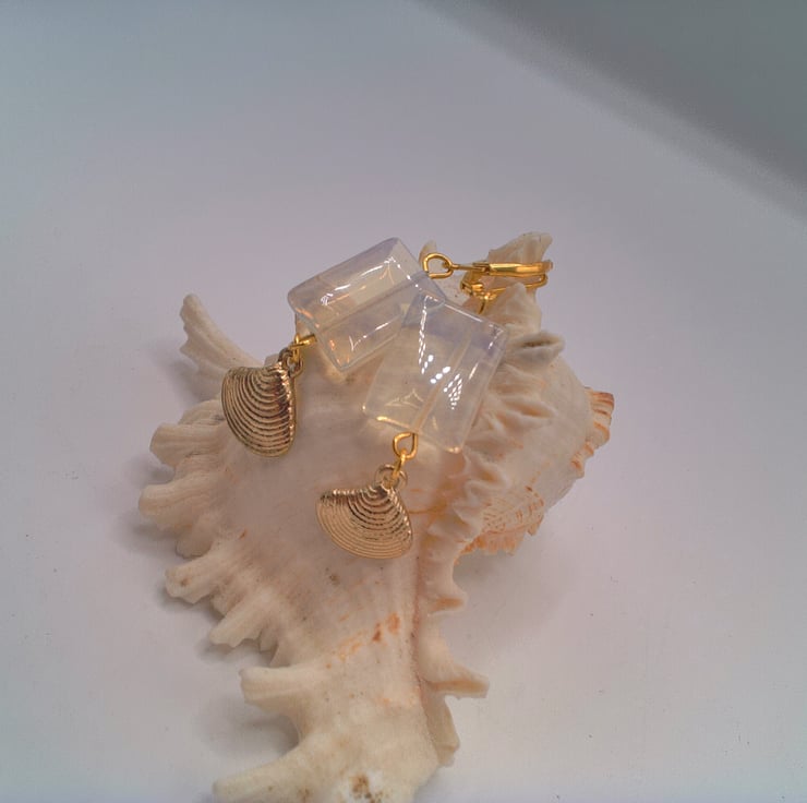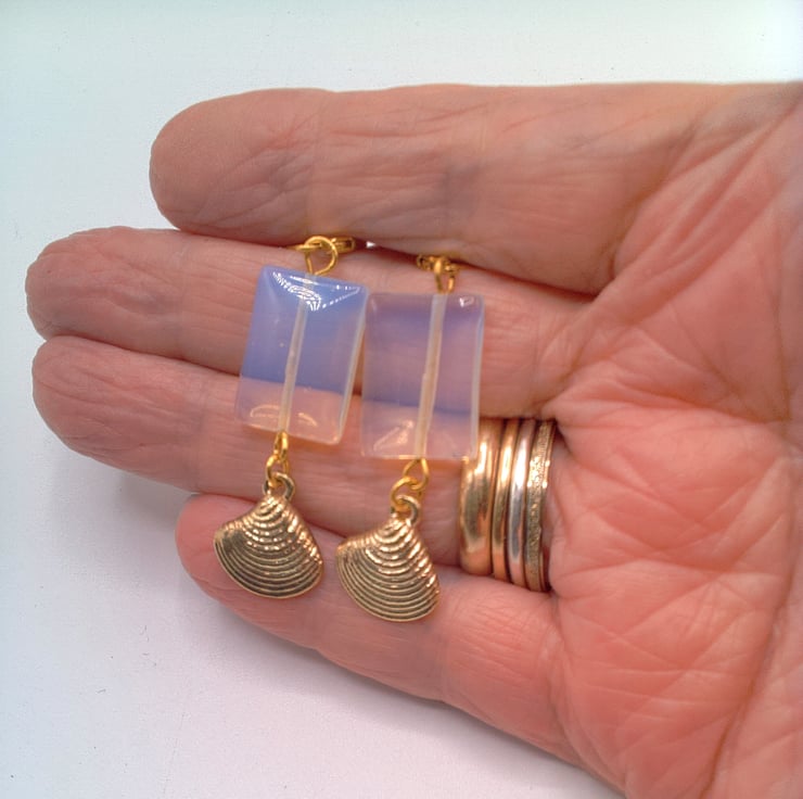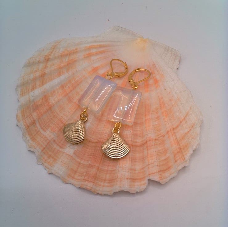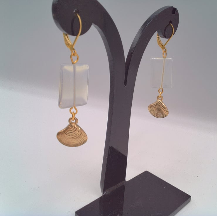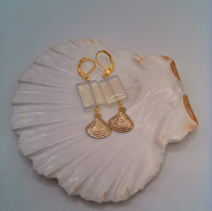 This pair of gorgeous milky white bead and clam shell dropper earrings go well with any outfit you wear for an evening out or a party. They would make an ideal gift for a friend or relative for a birthday, an anniversary, or a treat for yourself. They are made using a 12 mm x 18 mm milky white rectangular bead and a 10 mm x 12 mm gold plated clam shell charm. They are suspended on gold plated lever back ear wires and they have a drop of 4 cm from the base of the ear wire. The earrings will be dispatched wrapped in tissue paper in an organza bag and delivered to you via Royal Mail first class post.