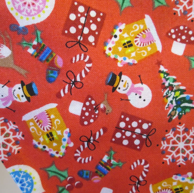 This bunting would be a beautiful addition to any home at Christmas. Pennants made from 100% cotton fabric featuring an array of colourful festive items including Santas, trees, snowflakes, baubles, candy canes and much more on a red background. Twelve flags, are arranged on white bunting tape the same fabric is used for each side so it can be hung either way, pennants measure approximately six inches across and seven and three quarter inches to the point (15 cm x 20 cm). There is approximately a tape gap of 3.5 inches (9 cm) between each flag and about 15 inches (38 cm) of tape at each end to aid displaying. Overall this string of bunting measures approximately 11ft 10ins (3.60 m). Created in a smoke and pet free home, designed as a decoration not a toy.