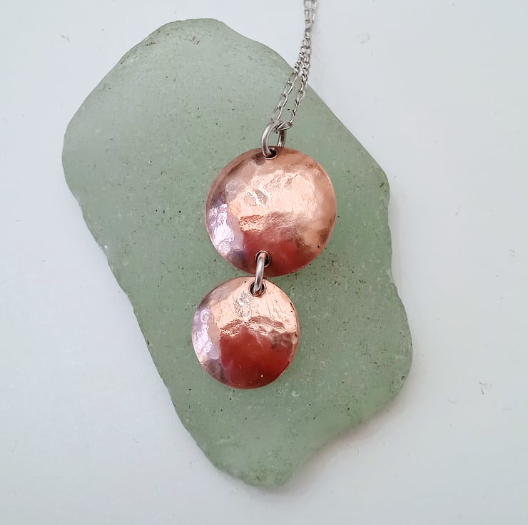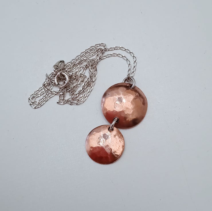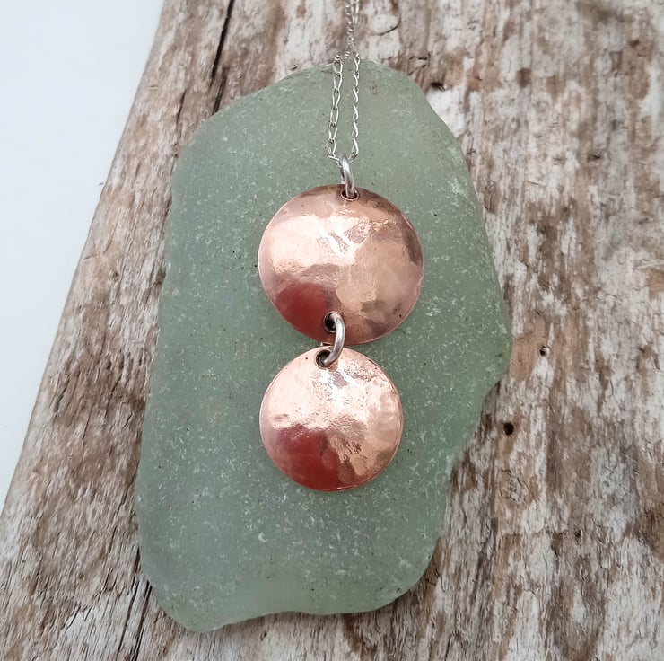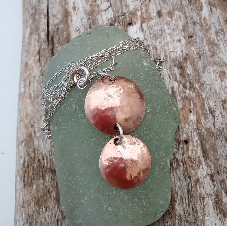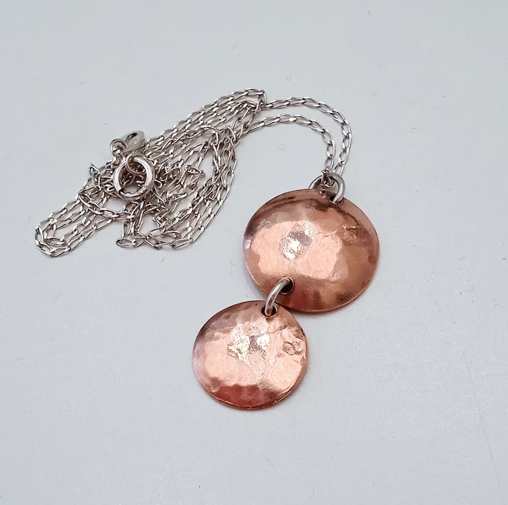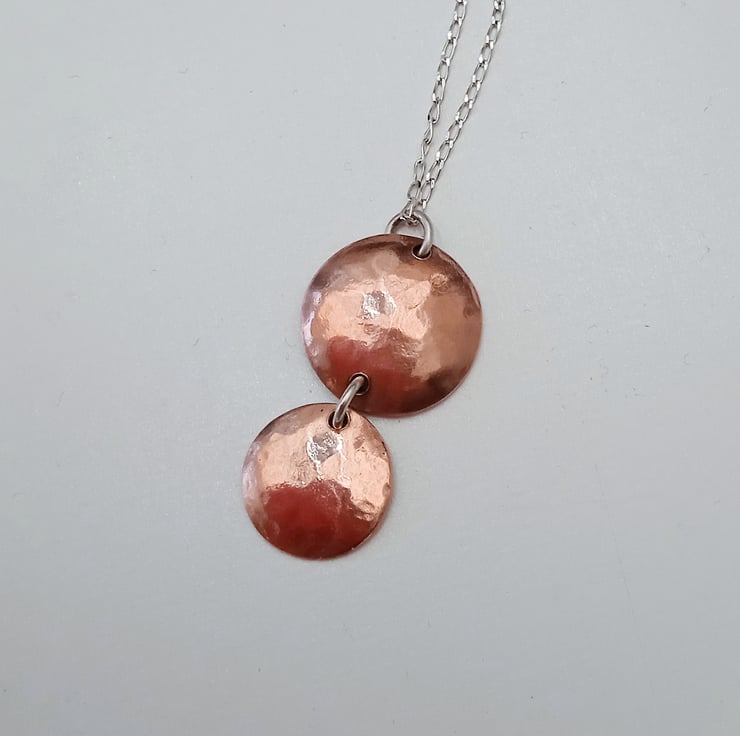 I have handmade this pendant from discs I have cut from copper, hammer textured and domed to create shape. I have joined them with a soldered sterling silver jump ring.