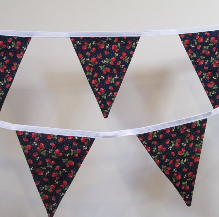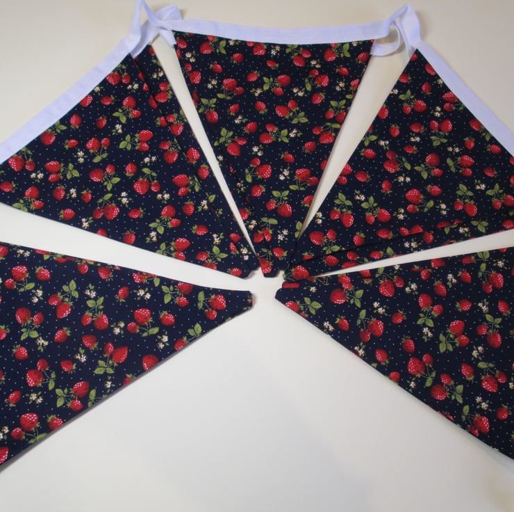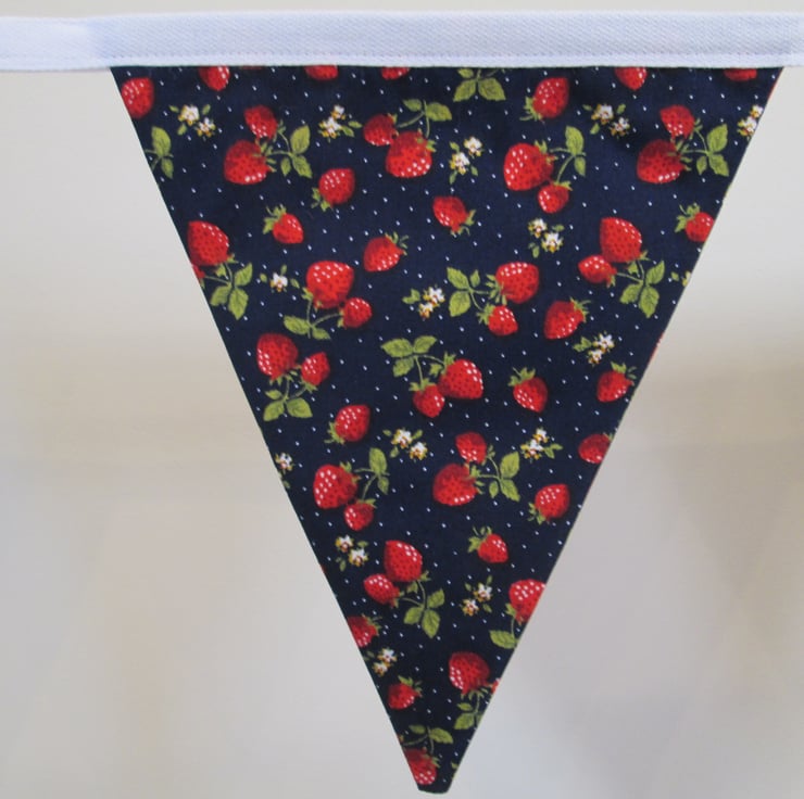 This bunting would be a beautiful addition to any home. Pennants made from 100% cotton fabric featuring an all over pattern of luscious strawberries and flowers on a dark blue background. Ten flags, are arranged on white bunting tape the same fabric is used for each side so it can be hung either way, pennants measure approximately six inches across and seven and three quarter inches to the point (15 cm x 20 cm). There is approximately a tape gap of 3.5 inches (9 cm) between each flag and about 15 inches (38 cm) of tape at each end to aid displaying. Overall this string of bunting measures approximately 10ft 2ins (3.1m). Created in a smoke and pet free home, designed as a decoration not a toy.