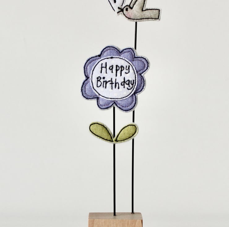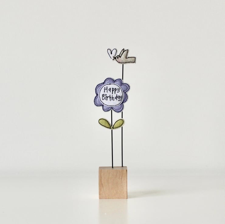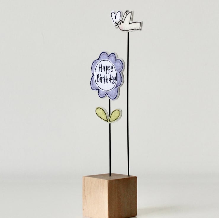 A handmade bloom and birdie for a birthday, on a wooden block.