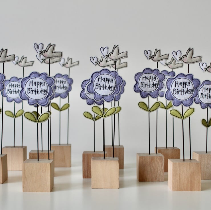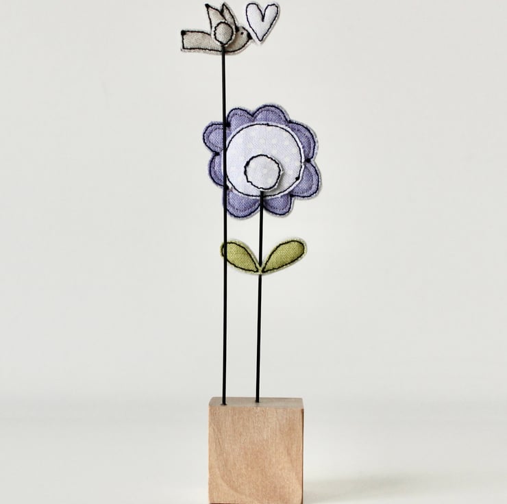 Each of the handmade blooms and birdies are sewn using cotton cloth, 100% wool felt and free hand machine embroidery; multiple layers of cloth are sewn together and cut out by hand using very sharp scissors. Each is mounted on a 3cm wooden cube which can adorn a mantle piece or any flat surface.