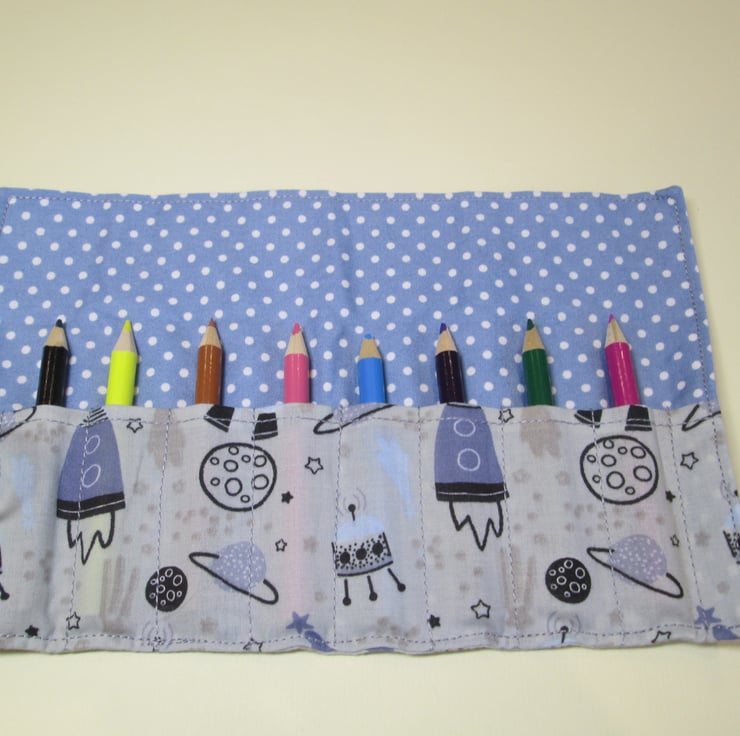 Fabric pencil roll complete with 8 pencils, handy for travelling, when visiting or eating out when you need to keep your little one occupied for a little while. This would make a perfect stocking filler, party bag gift, or indeed an any time gift.