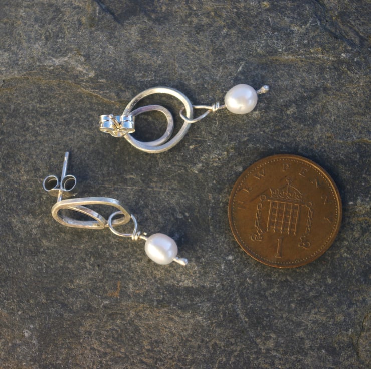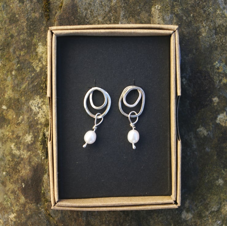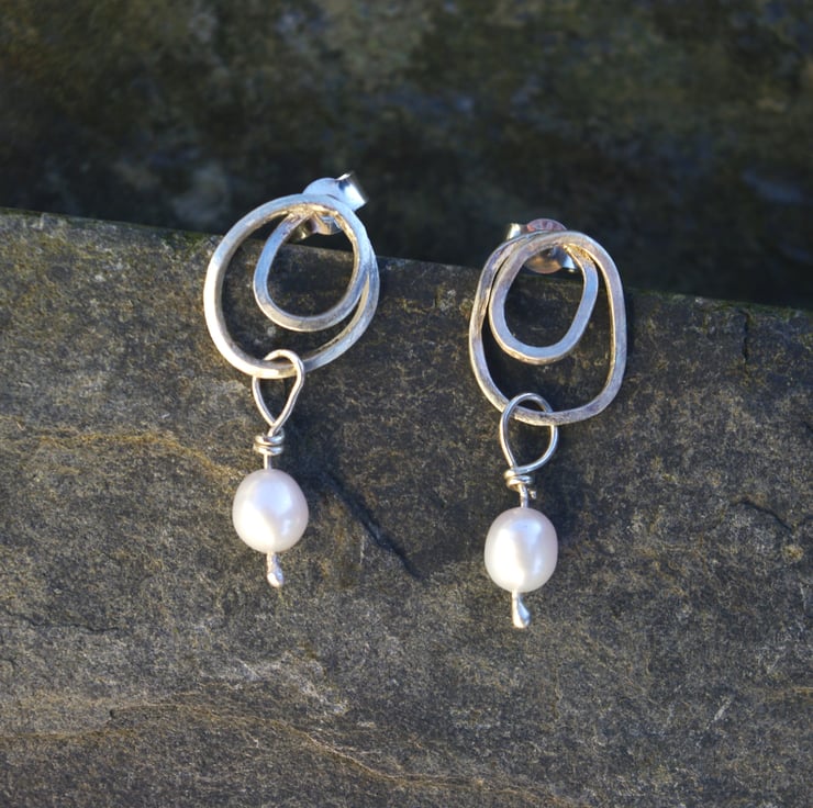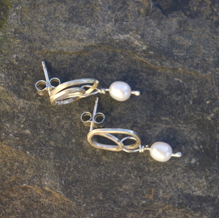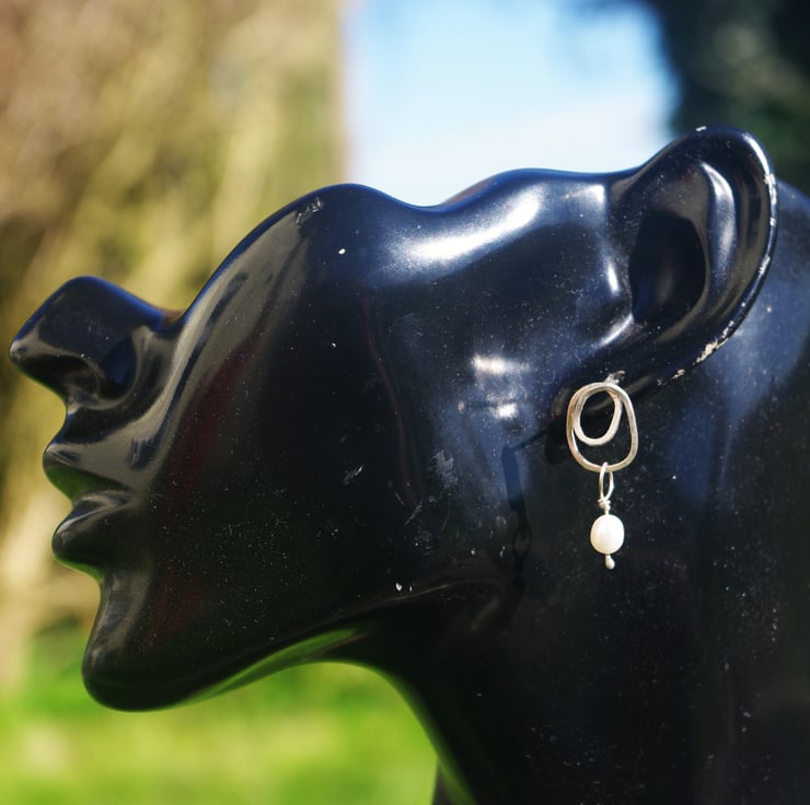 A silver swirl made from eco sterling silver square wire, sits on the earlobe, with a sterling silver stud fastening. The ends of the swirl join together and freshwater pearls dangle from the bottom edge on a piece of sterling silver wire which is wound around so that the pearl won't fall off.