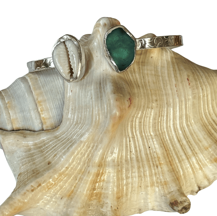Sea Glass Cowrie Shell Sterling Silver Cuff Bangle