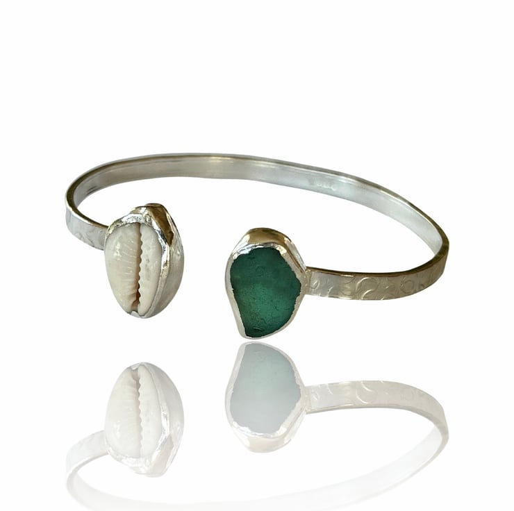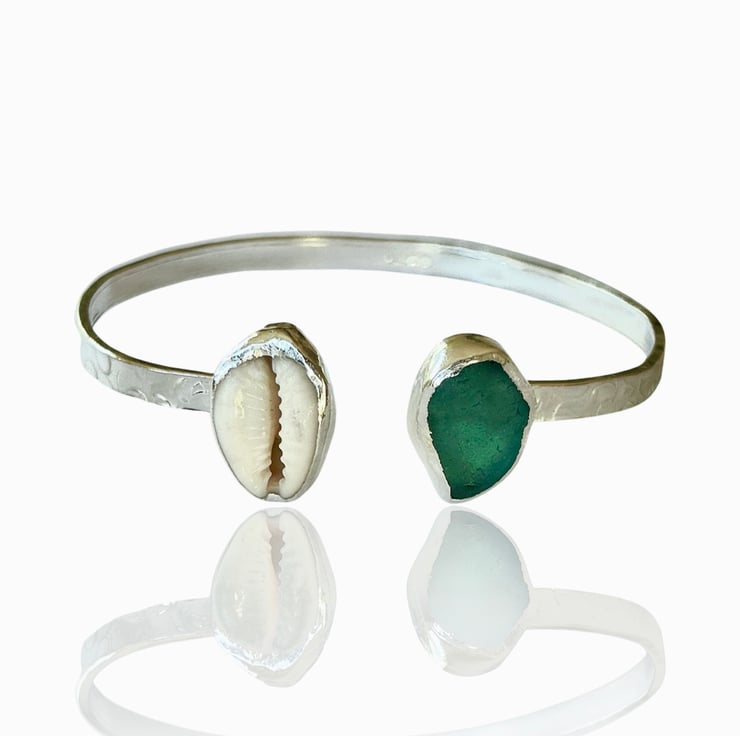 This beautiful sterling silver sea Glass Cowrie shell bangle will make a unique and eye-catching addition to any jewellery collection. The 4mm wide silver cuff band has a rippling pattern finish and soldering on either side of the opening of the cuff is a Cowrie Shell and an Ocean Sea Glass, both encased in sterling silver, creating an elegant Bohemian style. Perfect for creating natural elements and making a fashion statement.