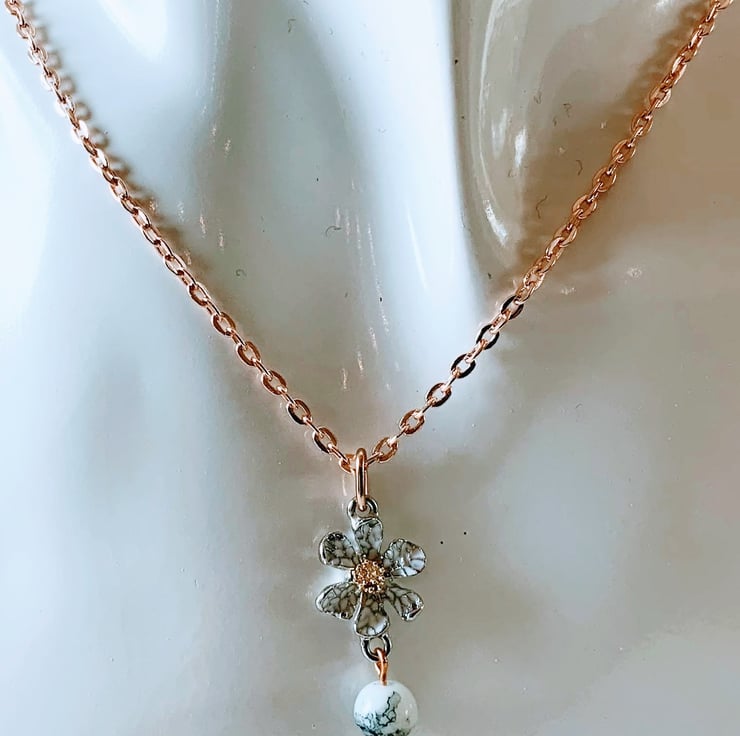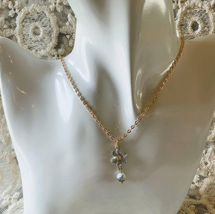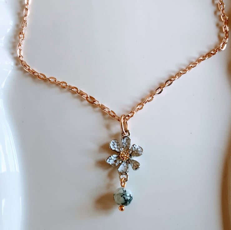 A beautiful white and silver enamel daisy with gold centre featuring a white marble porcelain bead at the bottom.