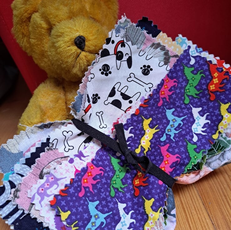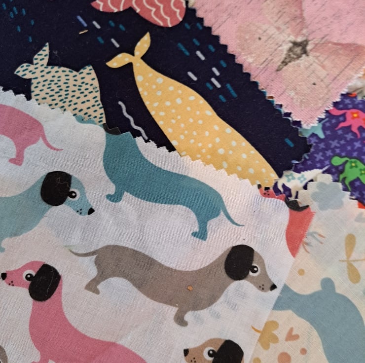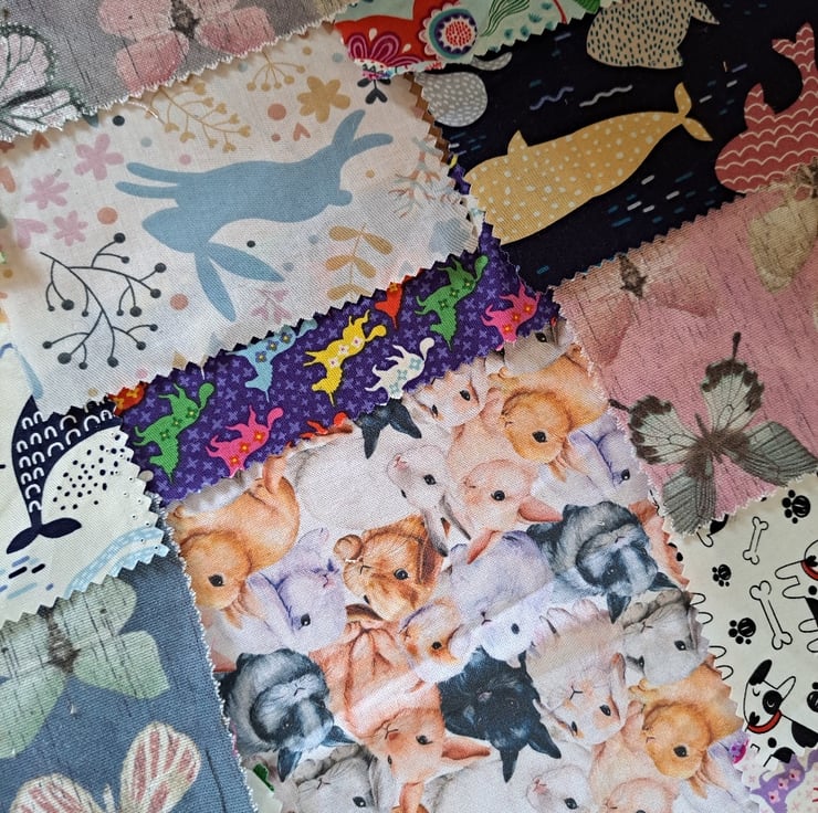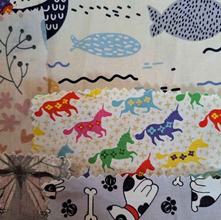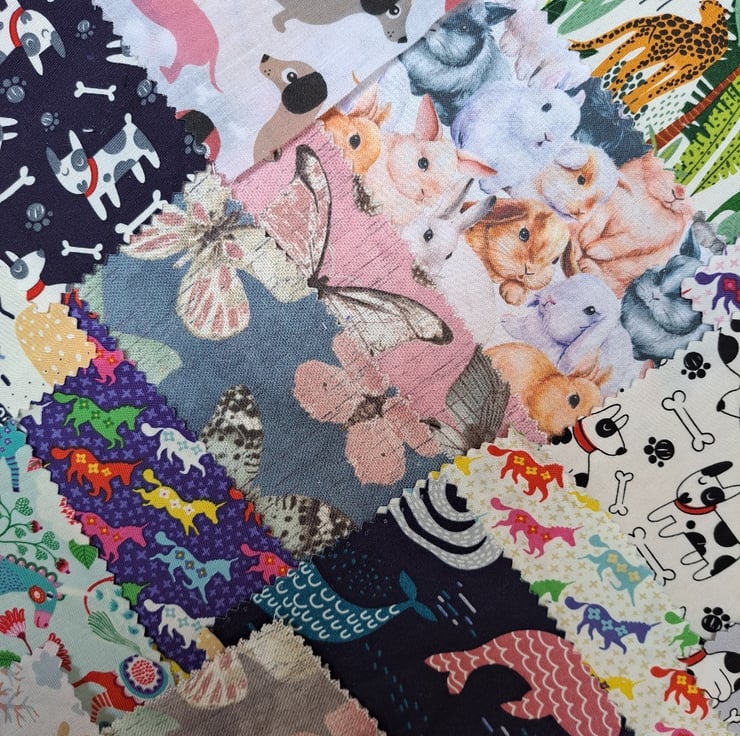 An adorable little bundle of small fabric pieces featuring animals. Mainly cotton though a few polycotton as well - all with upbeat patterns of dogs, whales, rabbits, unicorns, you name it. These are largely new dressmaking or craft fabric snippets and sizes range from 15cm by 23cm for the largest to 10cm by 9cm for the smallest. Just lovely to own.