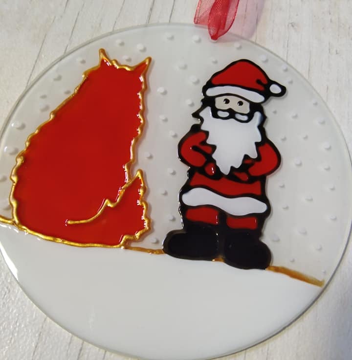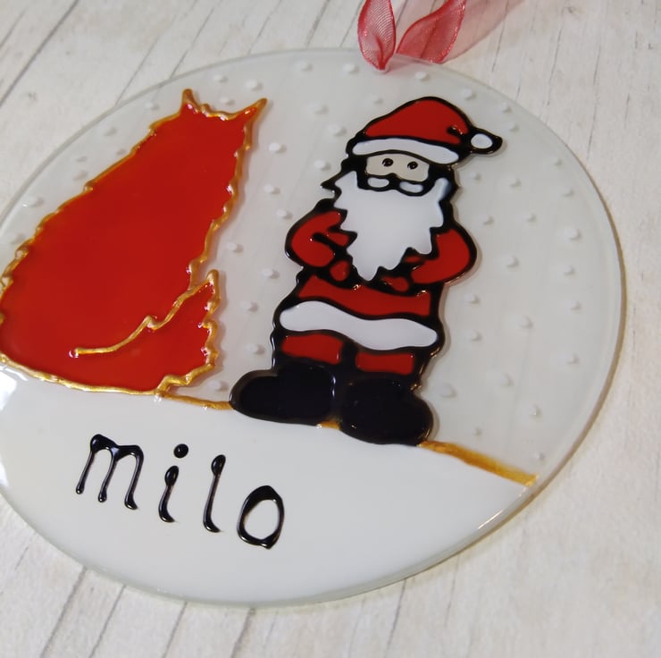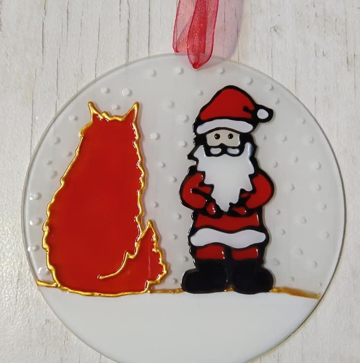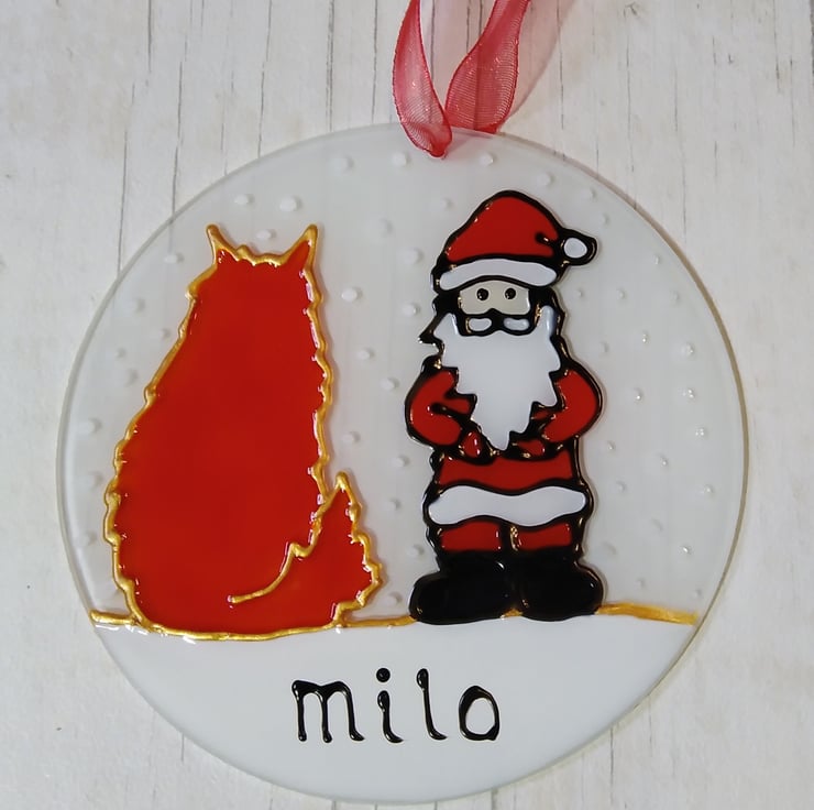 A beautiful Maine Coon sits next to a Santa. The cat is orange but other colours are available on request. The back of the sun catcher is painted white so it gives it a bit of a 3D effect when looking from the front. Can be personalised with upto 10 letters including spaces. Finished with a red organza ribbon.