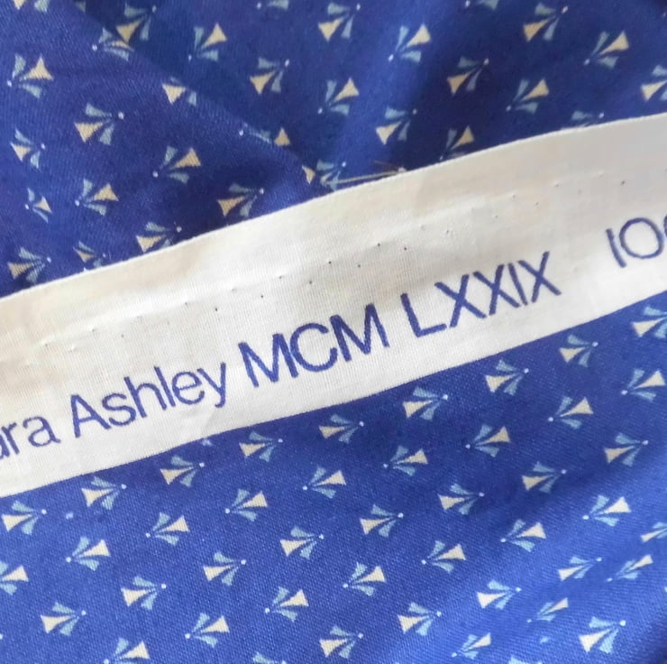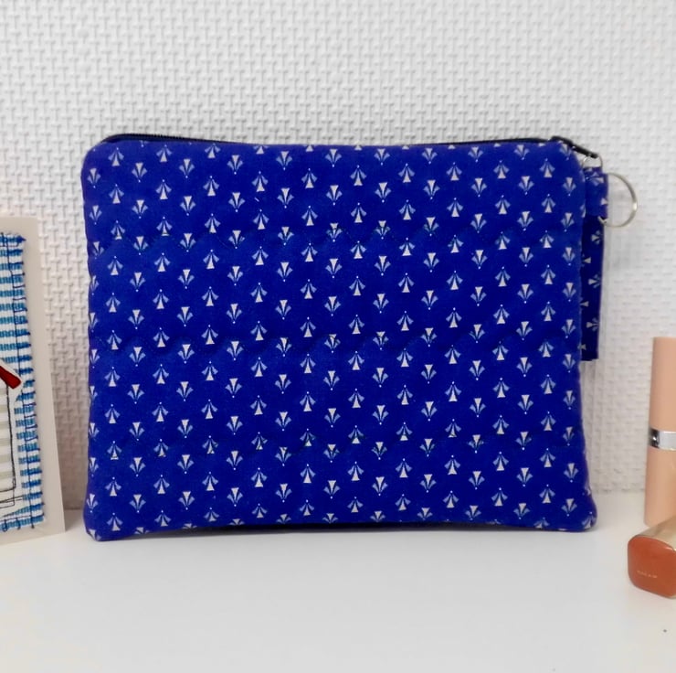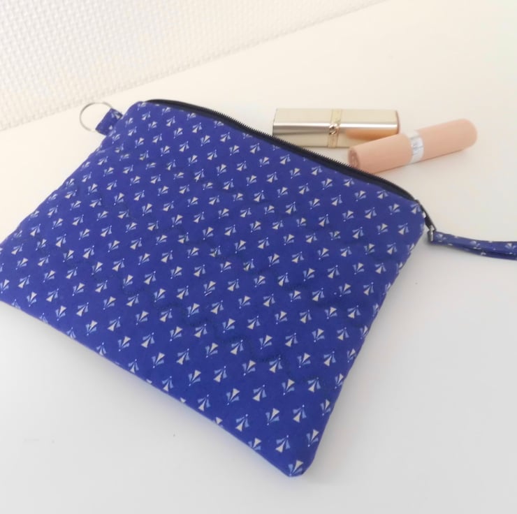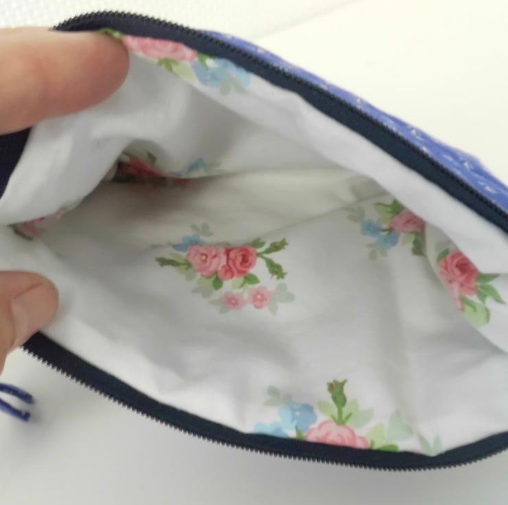 This zipped purse is made with a vintage, new and unused, 100% cotton by Laura Ashley. Deep blue background with tiny print, from 1979. I backed this fabric with fusible quilter's wadding and then machine stitched across each side with three rows of wave stitch to achieve a lightly quilted effect. It has a floral cotton lining, also by Laura Ashley, pink and blue posies on white background.