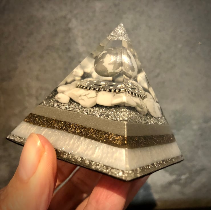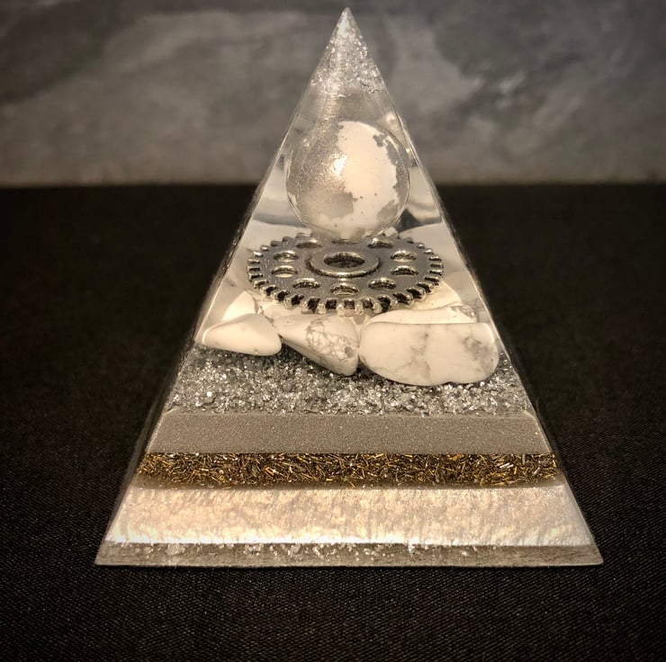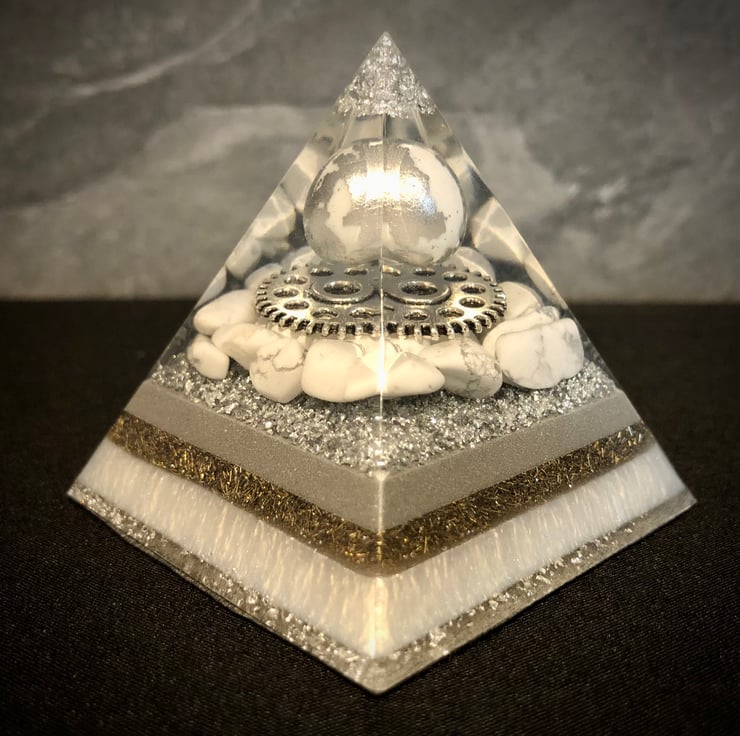 Made from resin, this stunning pyramid design encases White Howlite and what an amazing gemstone this is (for more information on White Howlite, please refer to the "inspiration" section below).