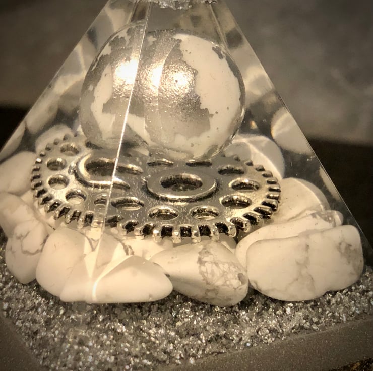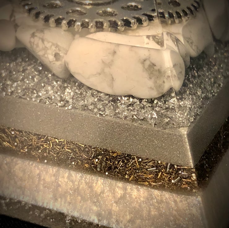 Silver leaf is incorporated at the tip of the pyramid and also runs through the layering adding an element of sparkle. A white and silver sphere has been placed as if "floating" above a silver metallic cog. Metal shavings have also been added along with white mica powder and aluminium powder to compliment the colour tones of the White Howlite.