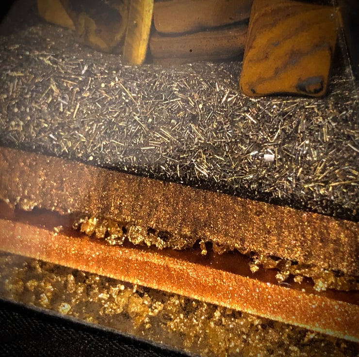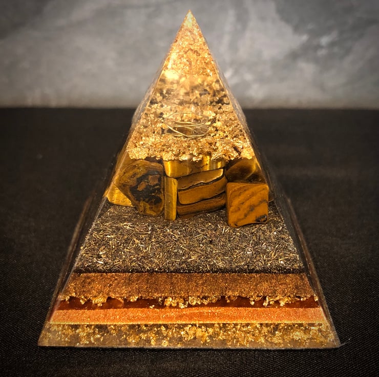 Oh my days, I just love this piece and love Tiger's Eye gemstones. A Clear Quartz wand has been encased and runs vertically through the centre of the pyramid wrapped in gold metallic wire to enhance it's placement. Gold leaf has also been incorporated to compliment the golden tones of the Tiger's Eye layer along with metal shavings and brown and bronze colour pigments.