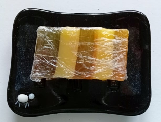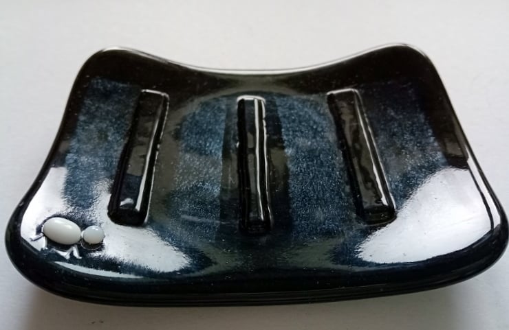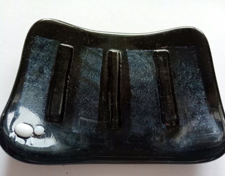Elevate your bathroom decor with our exquisite handcrafted fused glass soap dish, beautifully crafted with black and silver glass and adorned with a charming sheepy detail. This stunning piece measures approximately 9cm x 12cm, providing ample space for your soap or trinkets. Each soap dish comes with a piece of handmade soap to get you started . Please note that the soap may differ from the one shown in the photo. Not only is this dish functional, but it can also be repurposed as a trinket dish, adding a touch of elegance to your dressing table or vanity