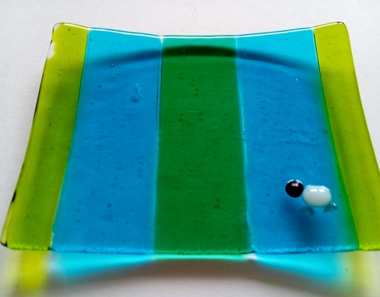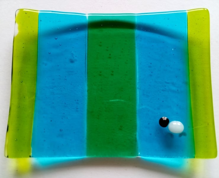 Measures approx 9cm x 12cm, this beautiful dish is made with spring green, turquoise, and aquamarine glass featuring adorable sheepy details. Comes with a piece of handmade soap! Soap may vary from photo. Perfect as a soap dish or trinket dish for your bathroom or home decor