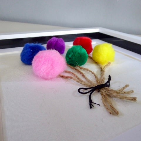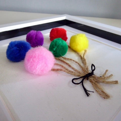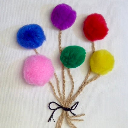 Who doesn't smile at a bunch of balloons? This bunch is made with left over pompoms and some string otherwise destined for landfill. It would be a beautiful addition to a nursery or child's bedroom.