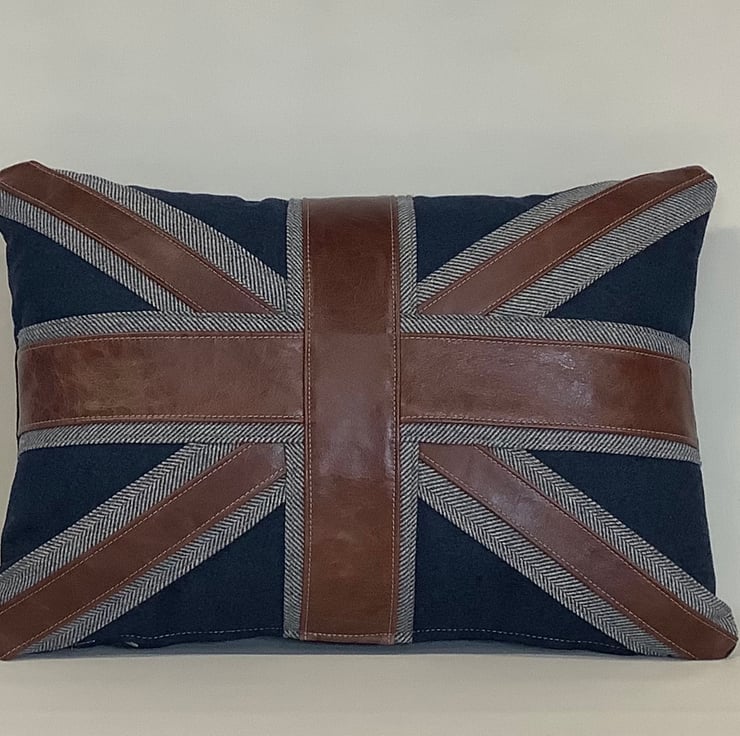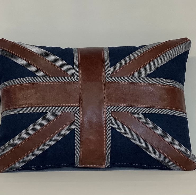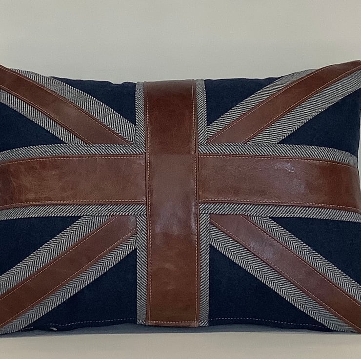A mixture of chevron wool and a dark blue wool, with a soft chestnut leather