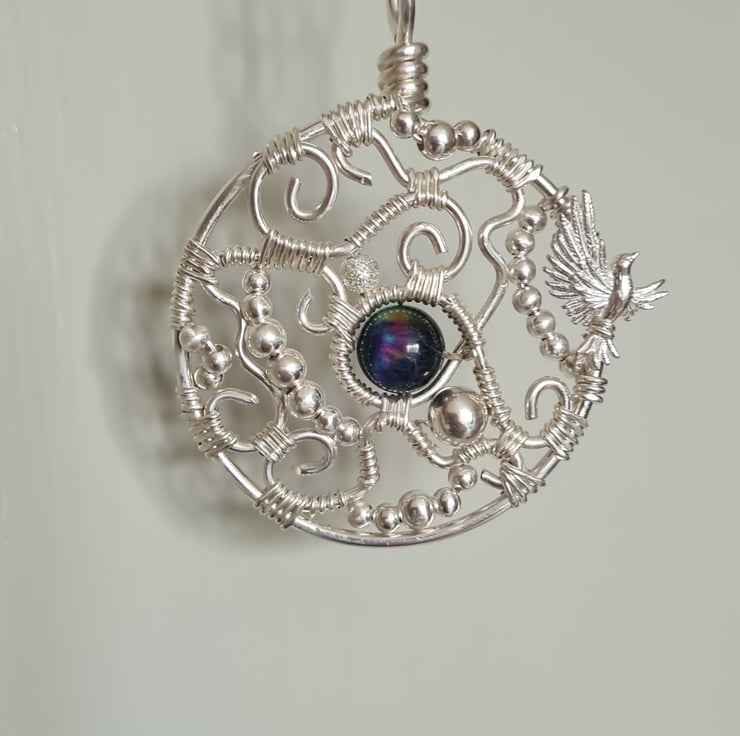 This is a large round Statement Pendant I have created from my own design, using 925 Sterling Silver Wire and a stunning Sterling Silver Hummingbird and Sterling Silver beads. At the center of the design is a beautiful multi coloured Galaxy Tiger Eye Bead which changes colour all around and has a amazing pattern. A real one of a kind piece and would make a ideal special gift.