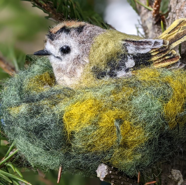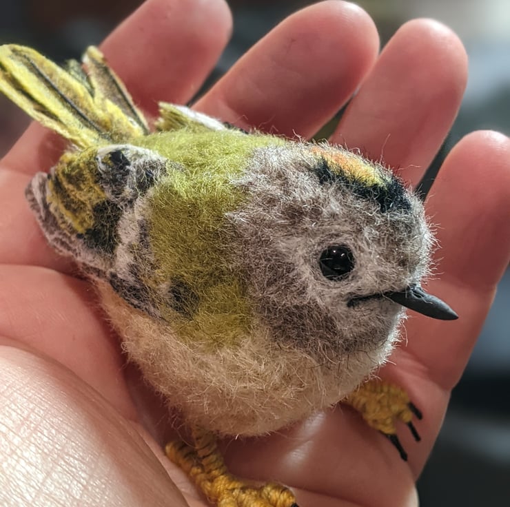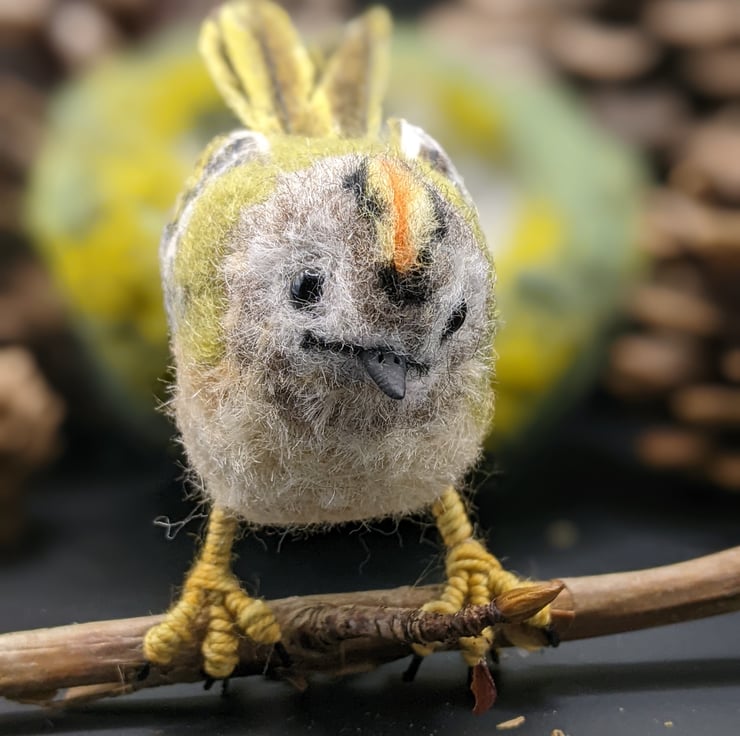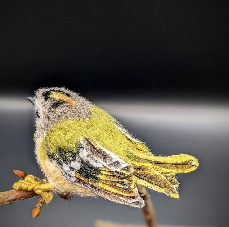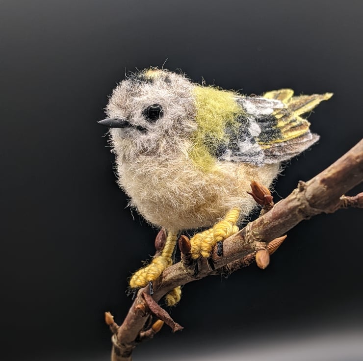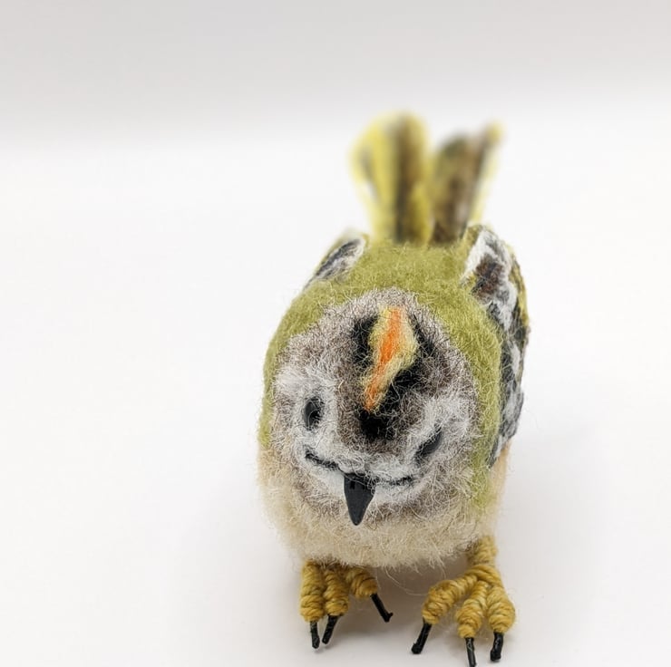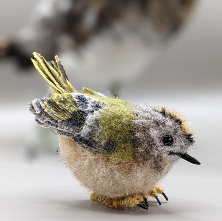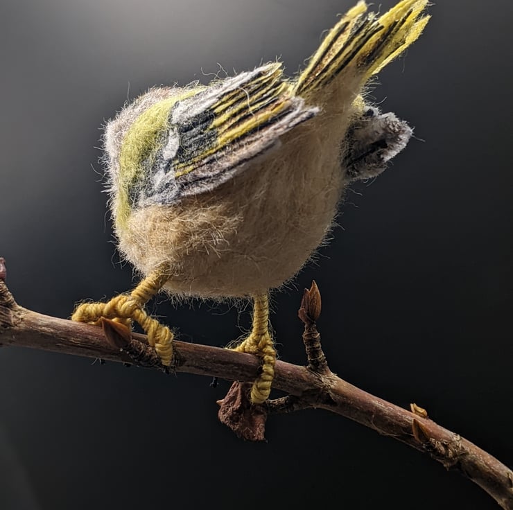 This little bird is very hard to let go of. She is perfect and tiny and has a delicious grumpy frown (they are known colloquially as Grumpies in Scotland, I believe). I really wanted to show the detail in her plumage and especially those flight and tail feathers. I used to have a favourite spot in an ancient woodland where I worked, that would often have Goldcrests in the trees, busily flitting between the branches. When I became ill and could no longer work, I really missed them and of course needed to make one of my own. She is not a toy, she is a treasure. Treat her kindly and she will bring you all the pleasure and delight of her lively tree-loving cousins.
