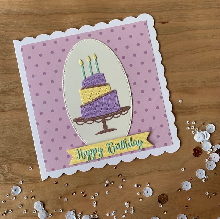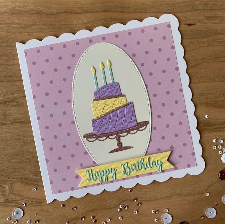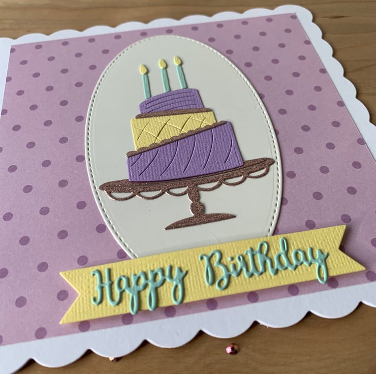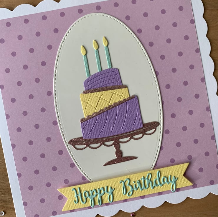 Made using die cut pieces, the design is set against a pink and purple spotted background.