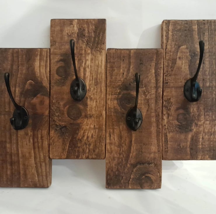 Handmade reclaimed pallet wood coat rack finished in dark oak fixed with traditional black metal coat hooks.