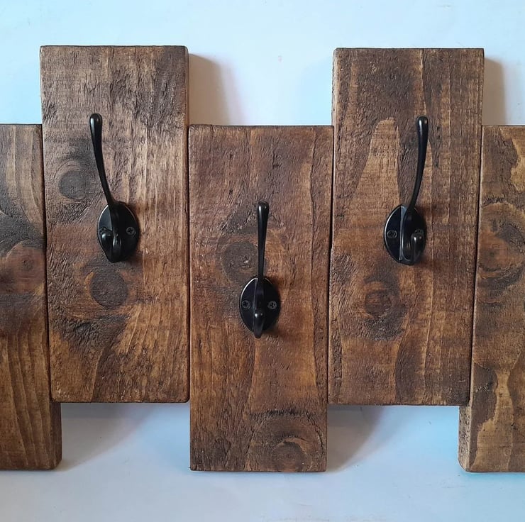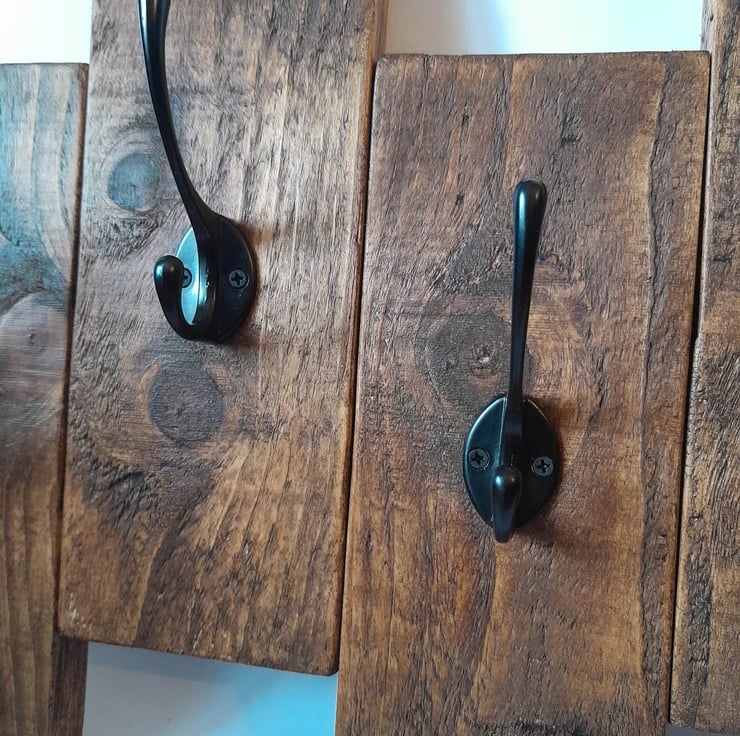 Handmade reclaimed pallet wood coat rack finished in dark oak fixed with traditional black metal coat hooks.