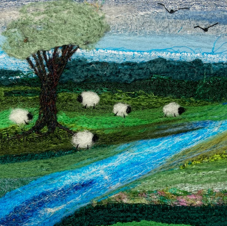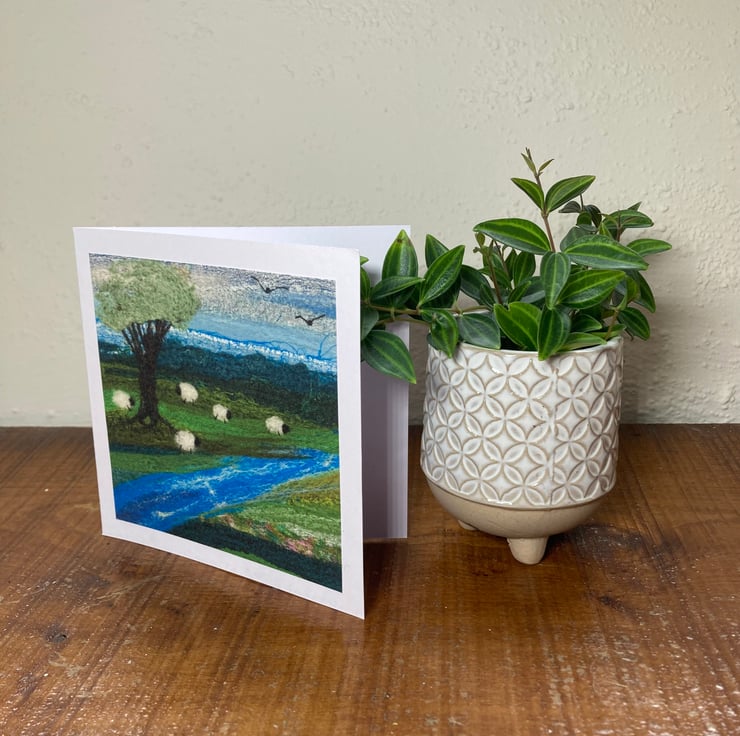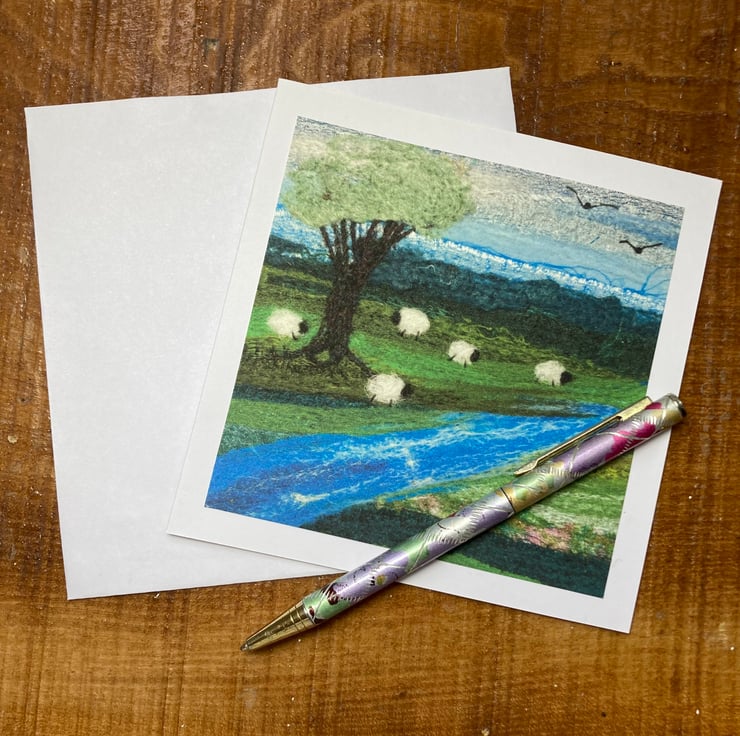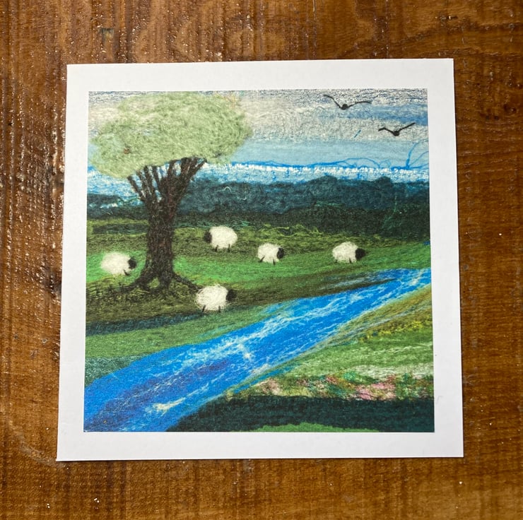A card of some sheep grazing by the river. This greetings card has been made using a print of some original textile artwork. The original artwork consists of needle felted silk fabric and wool fibres. The print has been mounted on a white card measuring 5"x5". It has been left blank for your own message and comes with a white envelope.