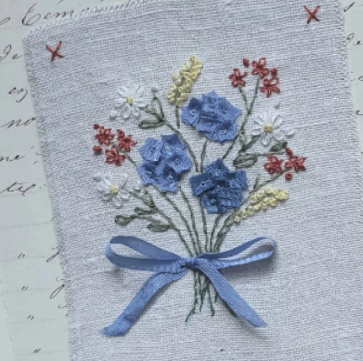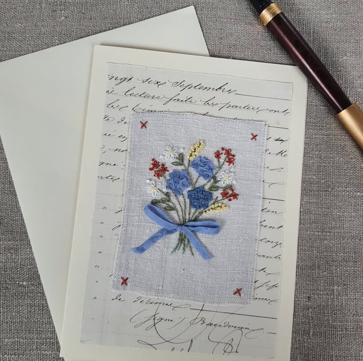 More than a card! Hand embroidered on vintage linen and mounted on a piece of vintage French manuscript on a blank card for your own message. Ideal for when you want to give more than a card as this beautiful card can be framed afterward.