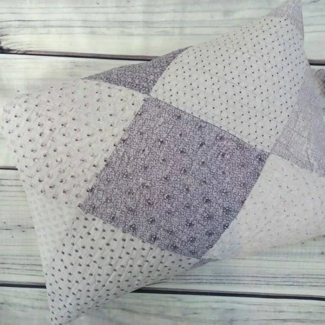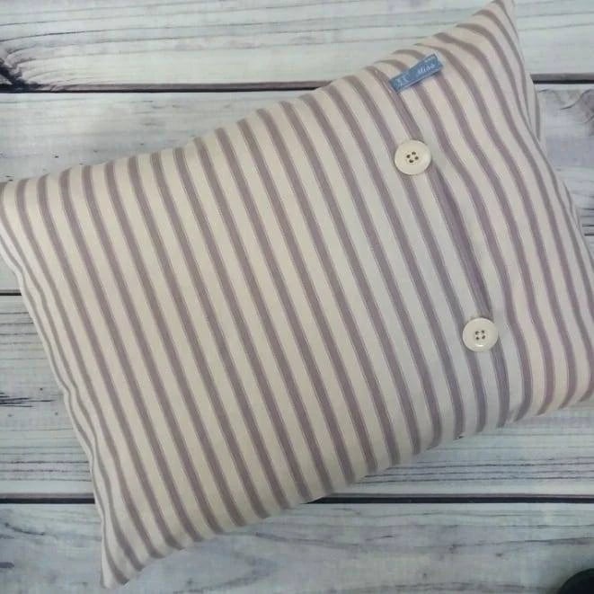 Beautiful cushion made from a lovingly aged handmade vintage quilt. Backed with coordinating fabric lavender ticking fastened with vintage buttons. Quality feather pad included 43 x 33 cm.
