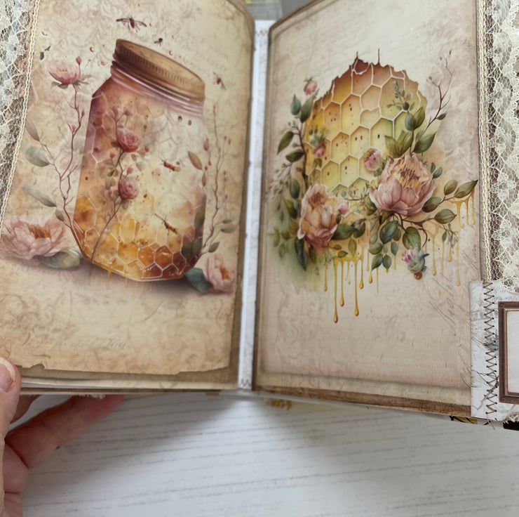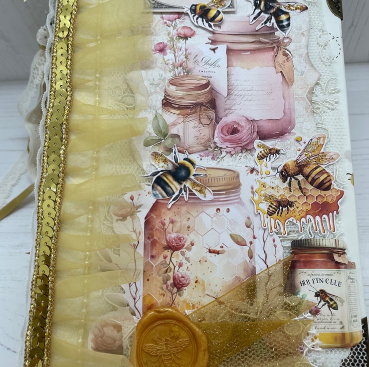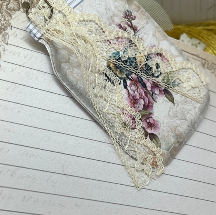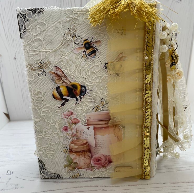 Summer Bee shabby chic journal. This journal has been handbound and covered in a pretty bee wrapping paper with a white spine. Lace on the front, back and spine decorated with fussy cuts to embellish. Wax melted disc hand stamped with a bee. inside the main page of the signature has a tab and lace stitched to the edge of the page.