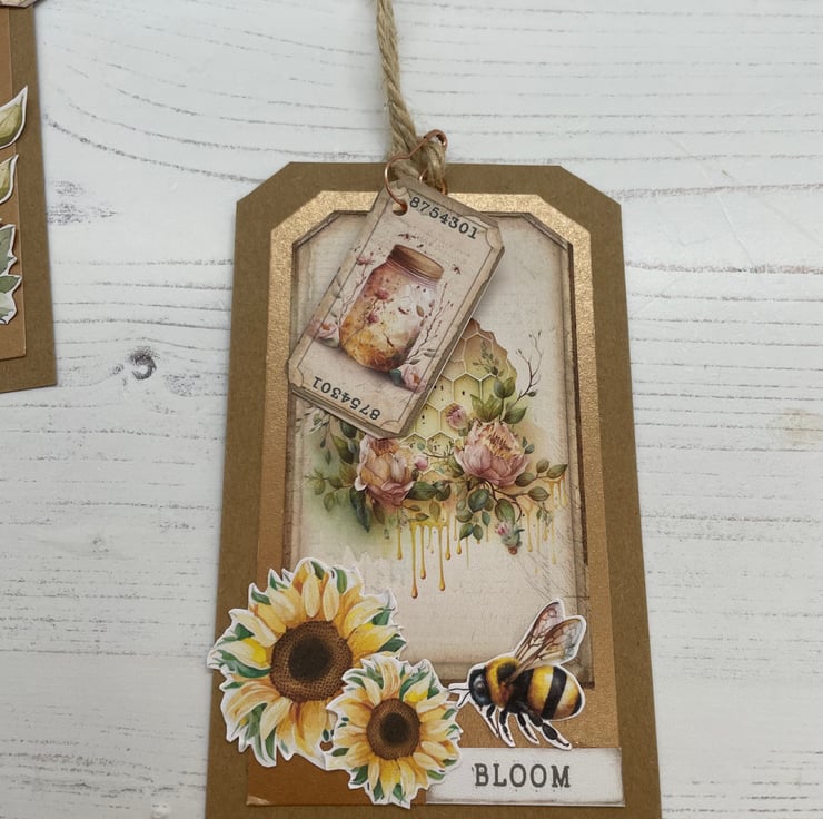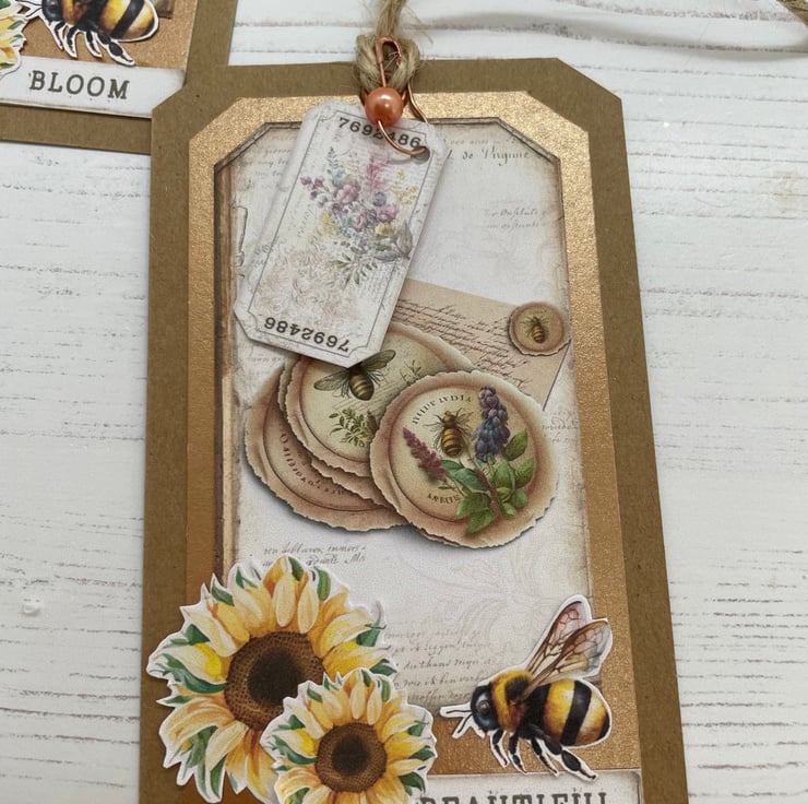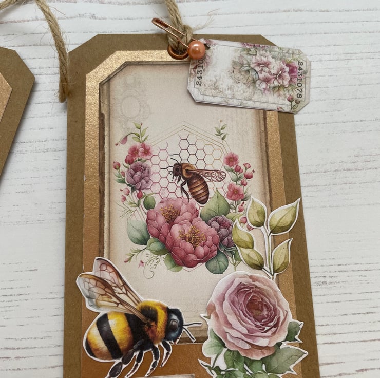 A set of 4 gift tags on kraft card, with pretty bee images and hand cut flowers and bees to embellish. String ties with a bulb rose gold pin with mini tag and peach pearl bead.