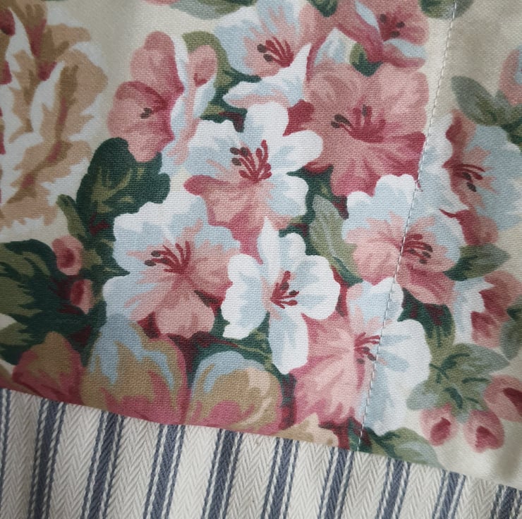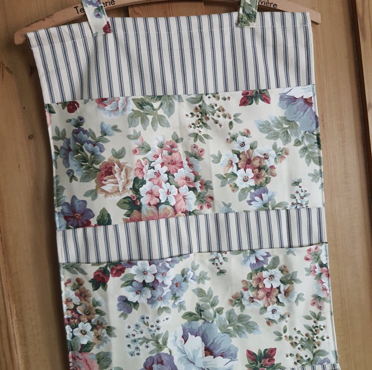 Beautiful four pocket organiser made from a lovely vintage floral fabric and ticking on a wooden vintage hanger. Ideal for hanging on a bathroom or bedroom door to hold toiletries and other items.