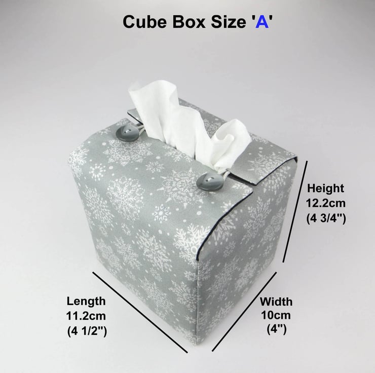 If your tissue box size is different than the measurements listed above, select the 'Custom Size' option and enter your tissue box measurements (height, width, and length) in the 'Custom Size' option box above.