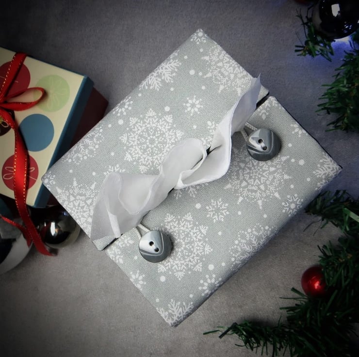 Holiday themed white snowflakes design on grey background, with black lining. Pattern placement varies.