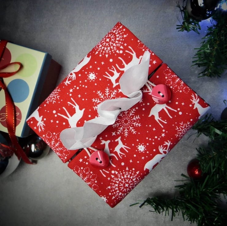 Holiday themed white reindeer design on red background, with black lining. Pattern placement varies.
