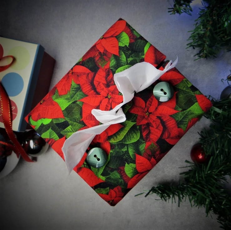 Holiday themed poinsettias design on green leaf pattern background, with black lining. Pattern placement varies.