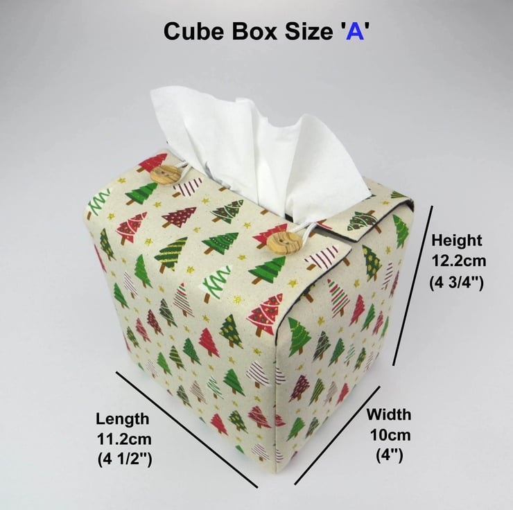 If your tissue box size is different than the measurements listed above, select the 'Custom Size' option and enter your tissue box measurements (height, width, and length) in the 'Custom Size' option box above.