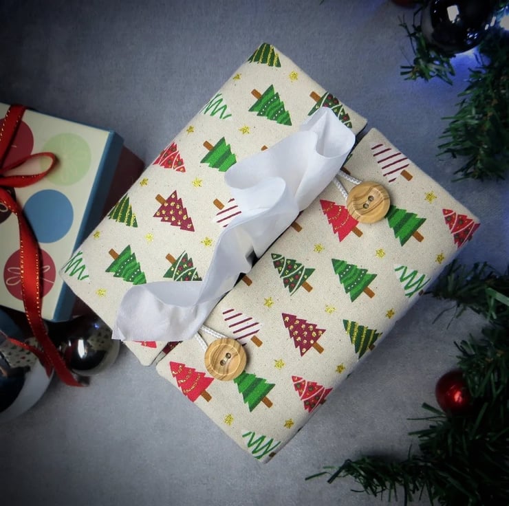 Holiday themed red, green, and white decorated trees design on beige background, with black lining. Pattern placement varies.