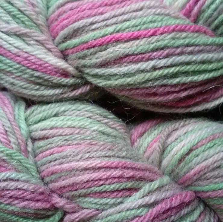 This hand dyed wool Alpaca blend is a light and bright mix of pale to medium pinks with minty Green It is lovely and soft and would be suitable for baby items, a little cardi or a shawlette.