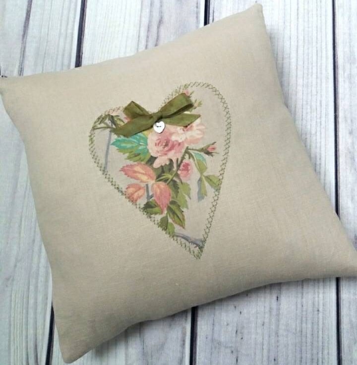 Linen cushion appliqued with a pretty vintage fabric heart finished off with a tiny ribbon and heart shaped pearl button. 33 x 33 cm with button back. Quality feather pad included.
