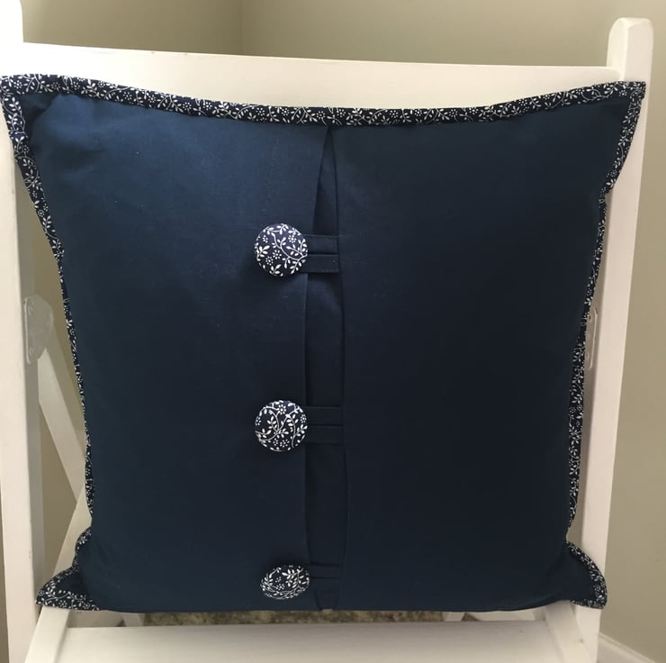 The cushion front has four pieced 8” blocks (2 x 2) joined into a square. The cushion has been backed with plain navy blue cotton and has a centre opening with three loop and fabric covered button closures. The wadding (middle layer) of the cushion front is a 100% needle punched polyester and has been machine quilted around the four 8” blocks. The cushion has a navy/white double layer cotton binding, hand finished on the reverse with slip stitching.