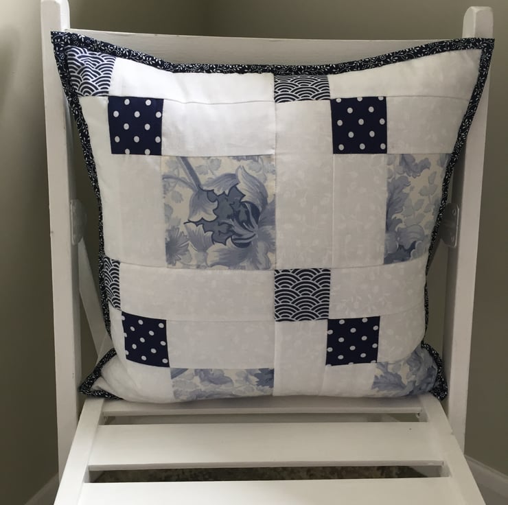 A 16”(41cm) square patchwork cushion in navy/blue/white cotton fabrics.