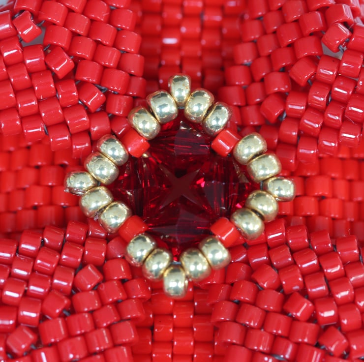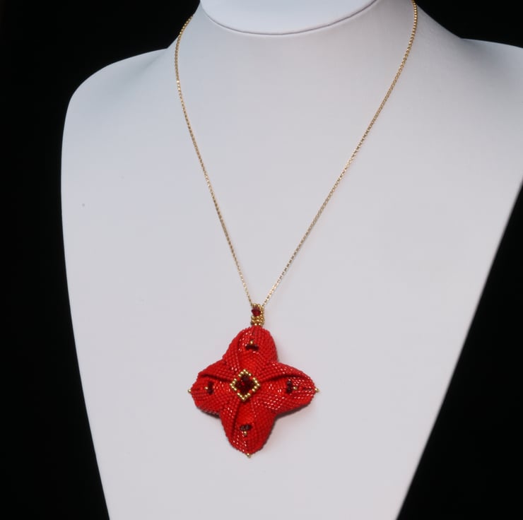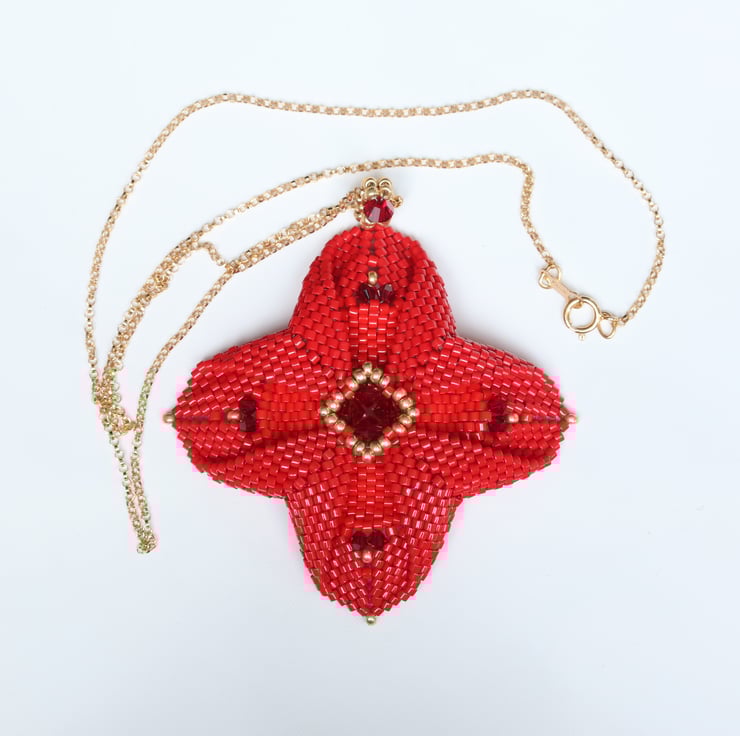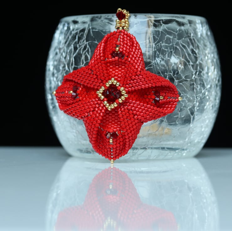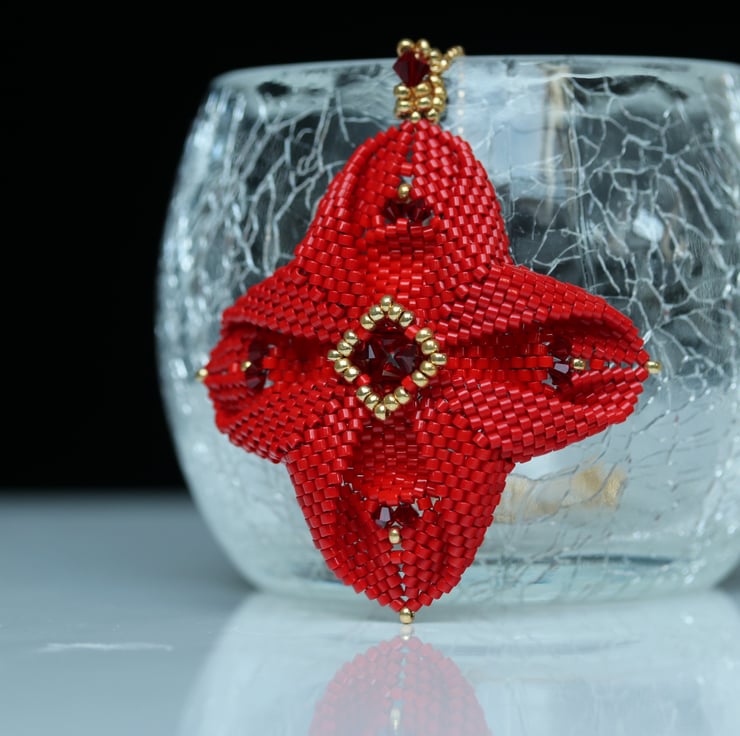 The corners of this pendant are folded into the middle, giving an interesting 3D effect. The piece is made by a process called bead weaving; the beads are sewn together using strong beading thread, not unlike fishing line. The pendant is embellished with tiny gold coloured seed beads and Swarovski bicone crystals (xilions) in a deep blood red colour (the colour of the crystals is called siam by Swarovski).