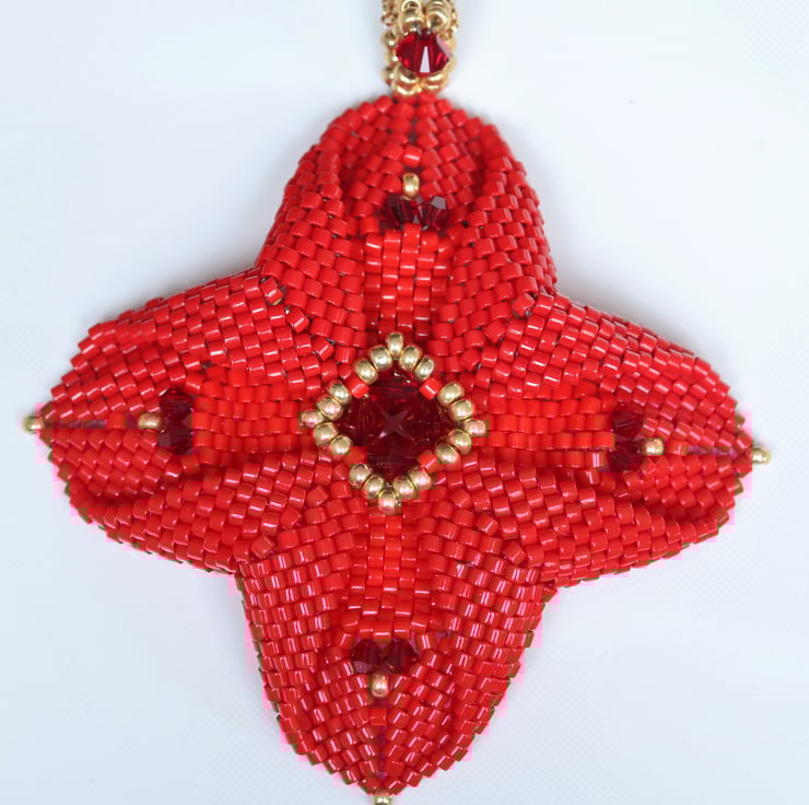 A beautifully structured 3D beadwork pendant made with scarlet opaque delica beads and embellished with gold coloured seed beads and blood red Swarovski crystals.