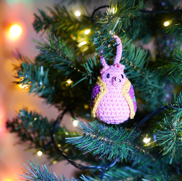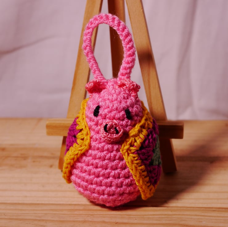 No Christmas is complete without a few pigs in blankets, this cute and humorous depiction of the favourite element of everyone’s Christmas dinner is a must for all trees that like something abit different. His plump little piggy body is wrapped in a jewel toned granny square style blanket and his ears and snout are done in a fine silky cotton, a hanging loop makes it easy to display this joyful oinker any where during the festive season. Measuring approximately two and a half inches wide (6.5cm) and three and a half inches tall (9cm) excluding hanging loop. Designed as a decoration not a toy created in a smoke and pet free home.
