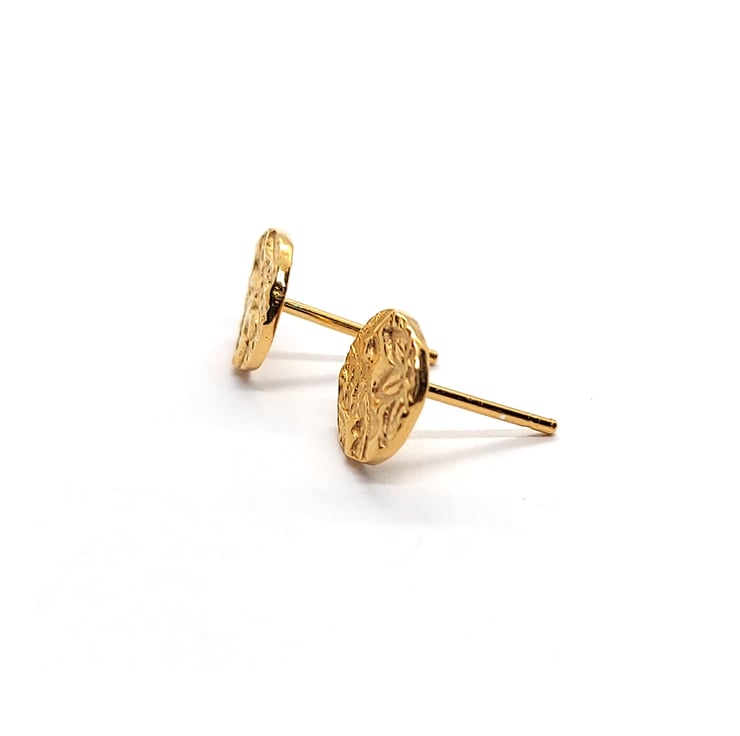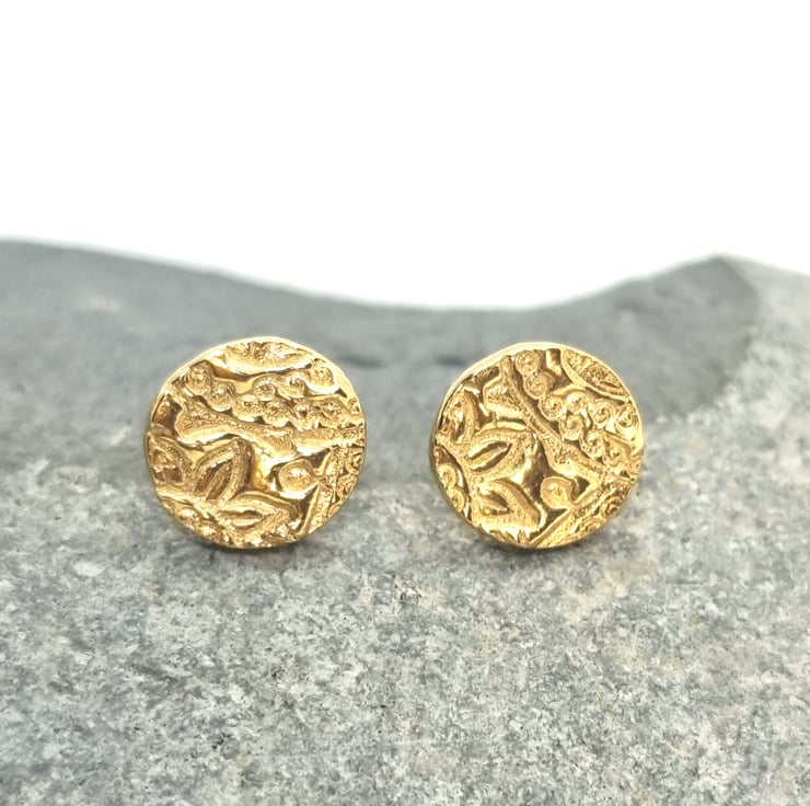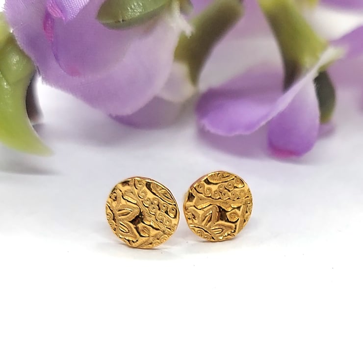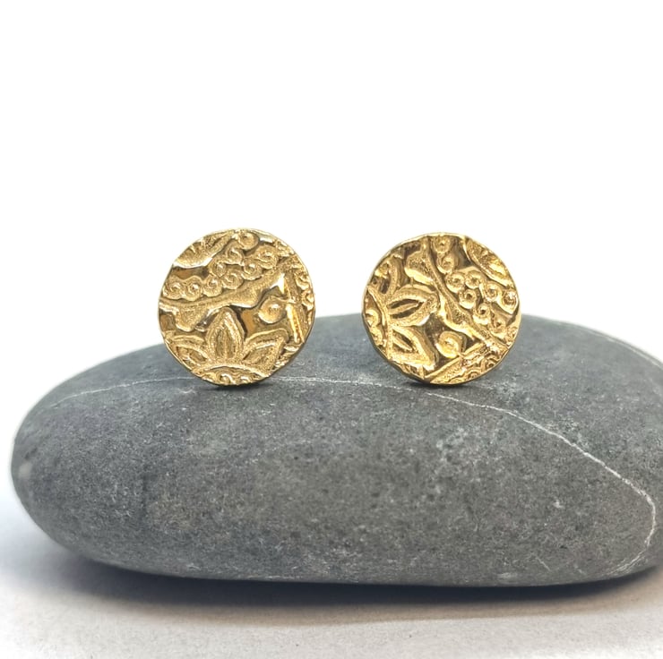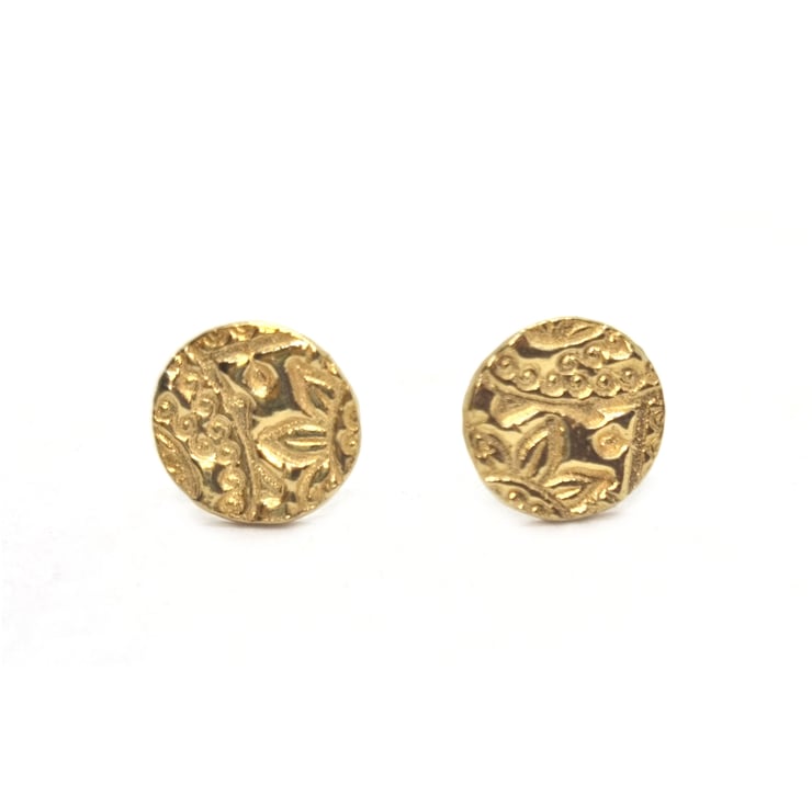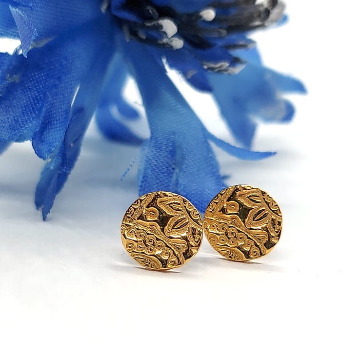These pretty round earrings are handmade in 22ct yellow gold vermeil plated solid sterling silver. The earrings feature a beautiful pattern for added interest.