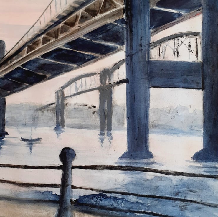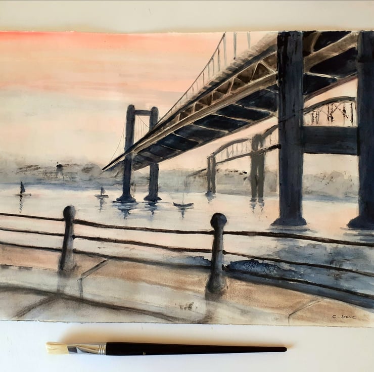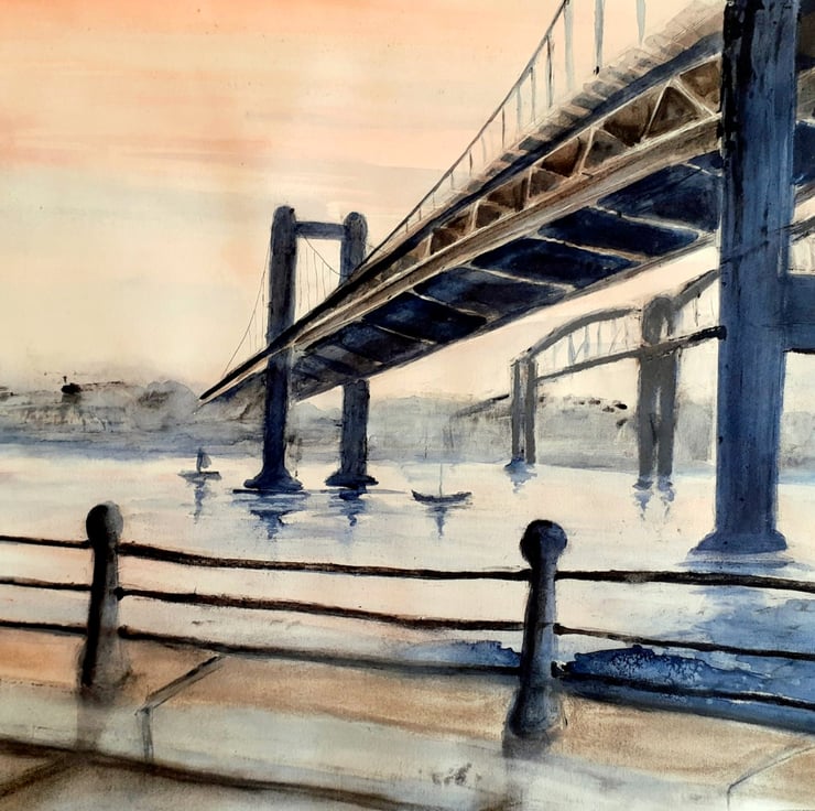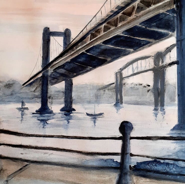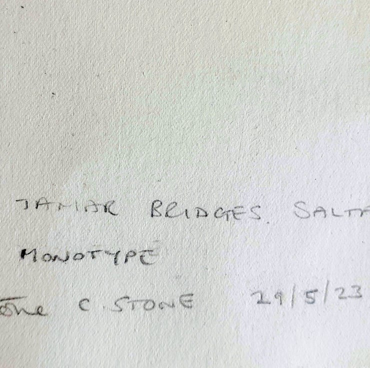 This one of a kind, hand drawn monoprint is based on my own sketches of the Tamar Bridges, on the River Tamar at Saltash, Cornwall.I have used the reductive drawing method, removing ink from the plate to produce the image.