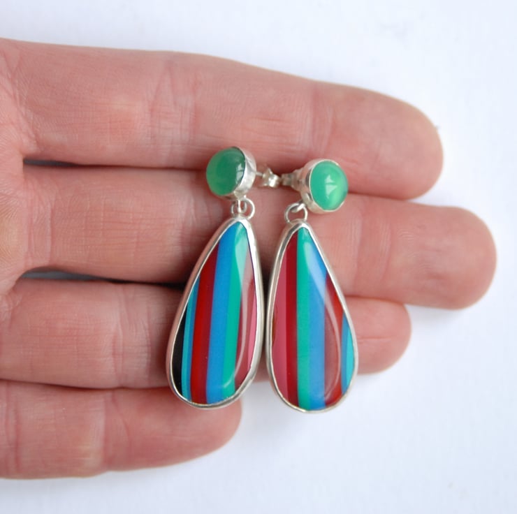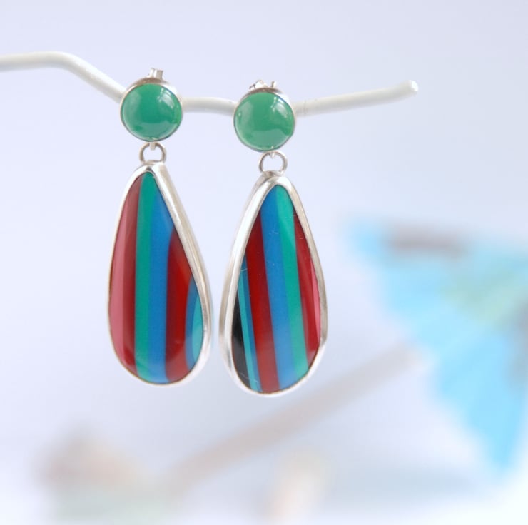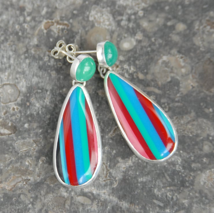 These colourful drop earrings feature striped cabochons of vibrant surfite and round green onyx which have been smoothly bezel set in sterling silver. The stripes in the surfite are blue, green, red and pink, the green matches well with the green onyx which is at the top of the earring hiding the post and scroll fitting. There is articulation between the stud top and main drop, the top section measures 8mm diameter whilst the bottom drop is 32mm by 15mm, total drop is approx 44mm.